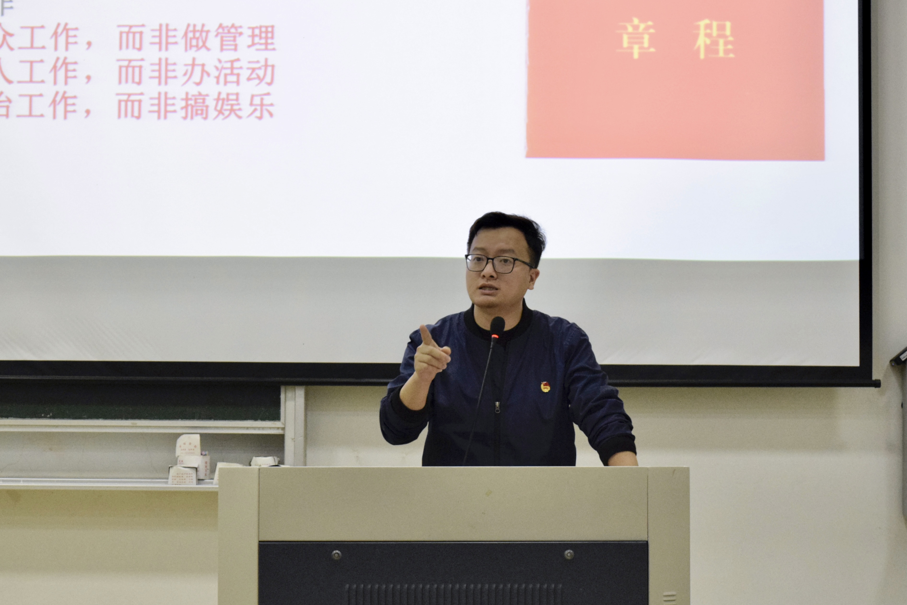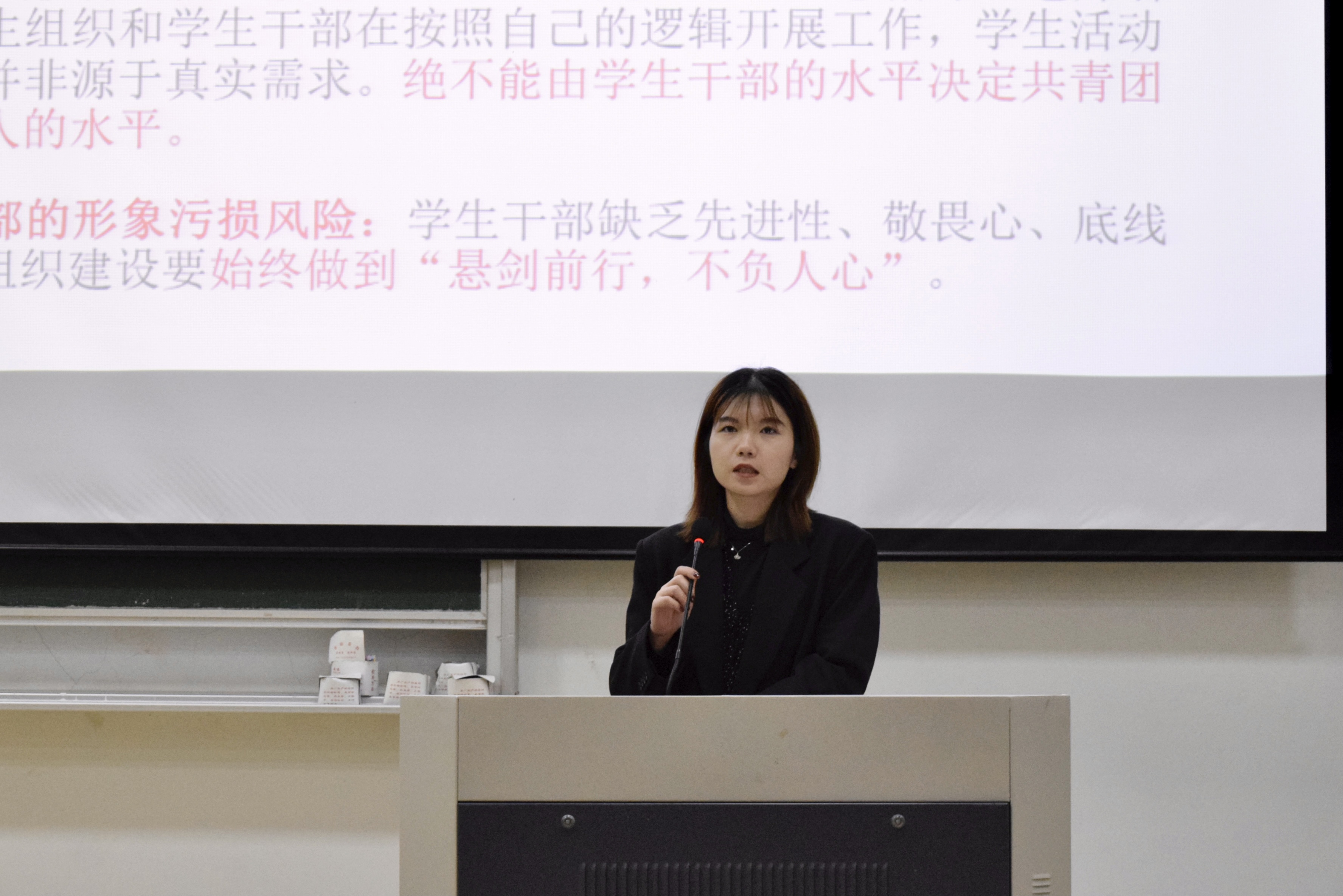夏文来老师以《关于共青团工作逻辑的思考》为主题授课。夏老师从共青团的历史讲起,阐述了对共青团组织的认识,提出了对团学干部的要求。他强调,共青团的工作本质是群众工作、育人工作和政治工作,坚定不移跟党走就是共青团的初心。团学干部要做好表率带领作用,引领学生的思想价值观念,加强个人学习、工作能力的锻造,提升自己对于组织的认同感,以点带面的服务同学,始终做到“悬剑前行,不负人心”!