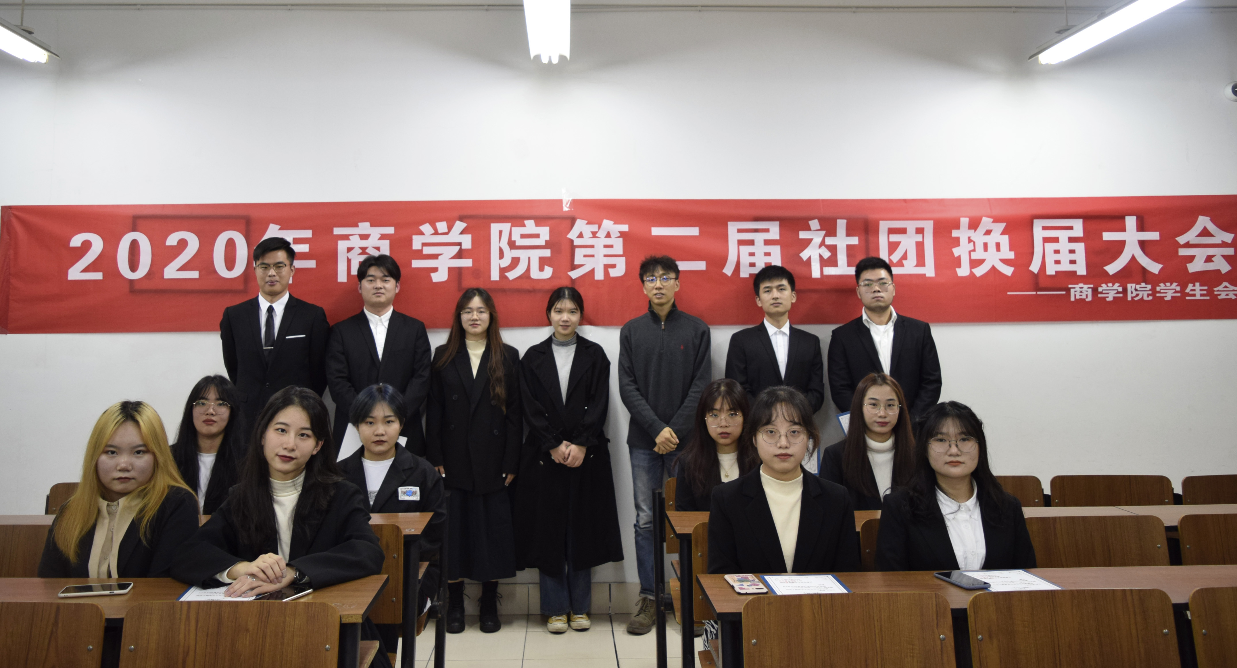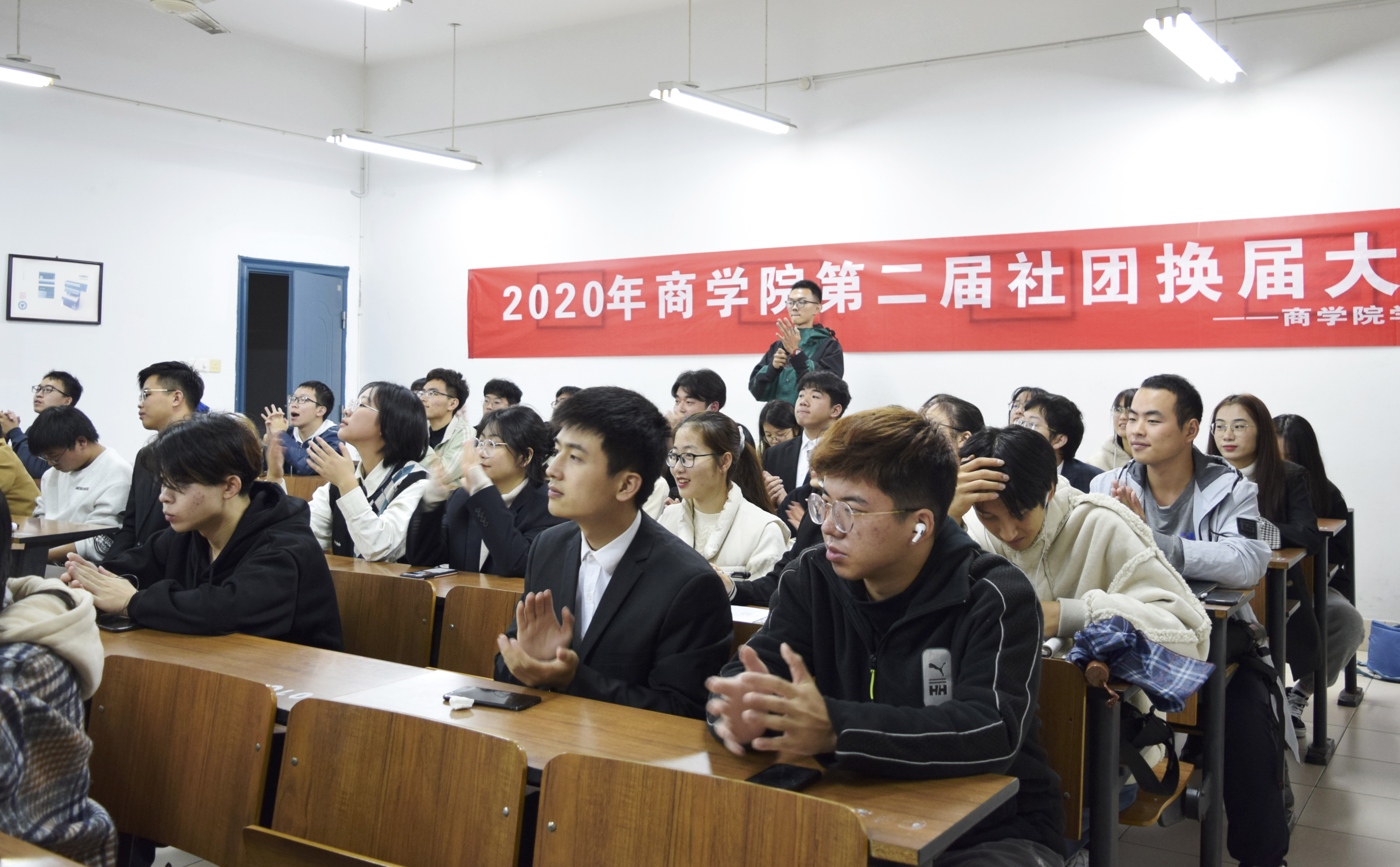 2020年11月25号晚,商学院于SB210举办社团换届大会。学院团委书记包静昇老师、团委副书记潘剑邦老师出席,学生会主席范帅盈、社团部成员及各社团成员参会。