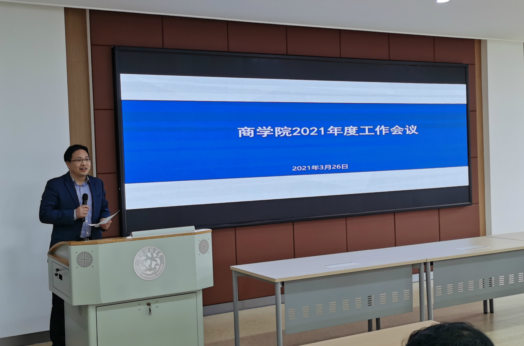 仲春时节,理工校园一派生机勃勃。3月26日下午,商学院举行2021年度工作部署会议暨“十四五”事业发展规划解读会,统一思想、凝聚共识、明确责任,确保“十四五”起好步、开好局。学院领导班子成员、各系务会成员、副高及以上职称教师、全体行政人员参加会议,会议由学院常务副院长林承亮主持。