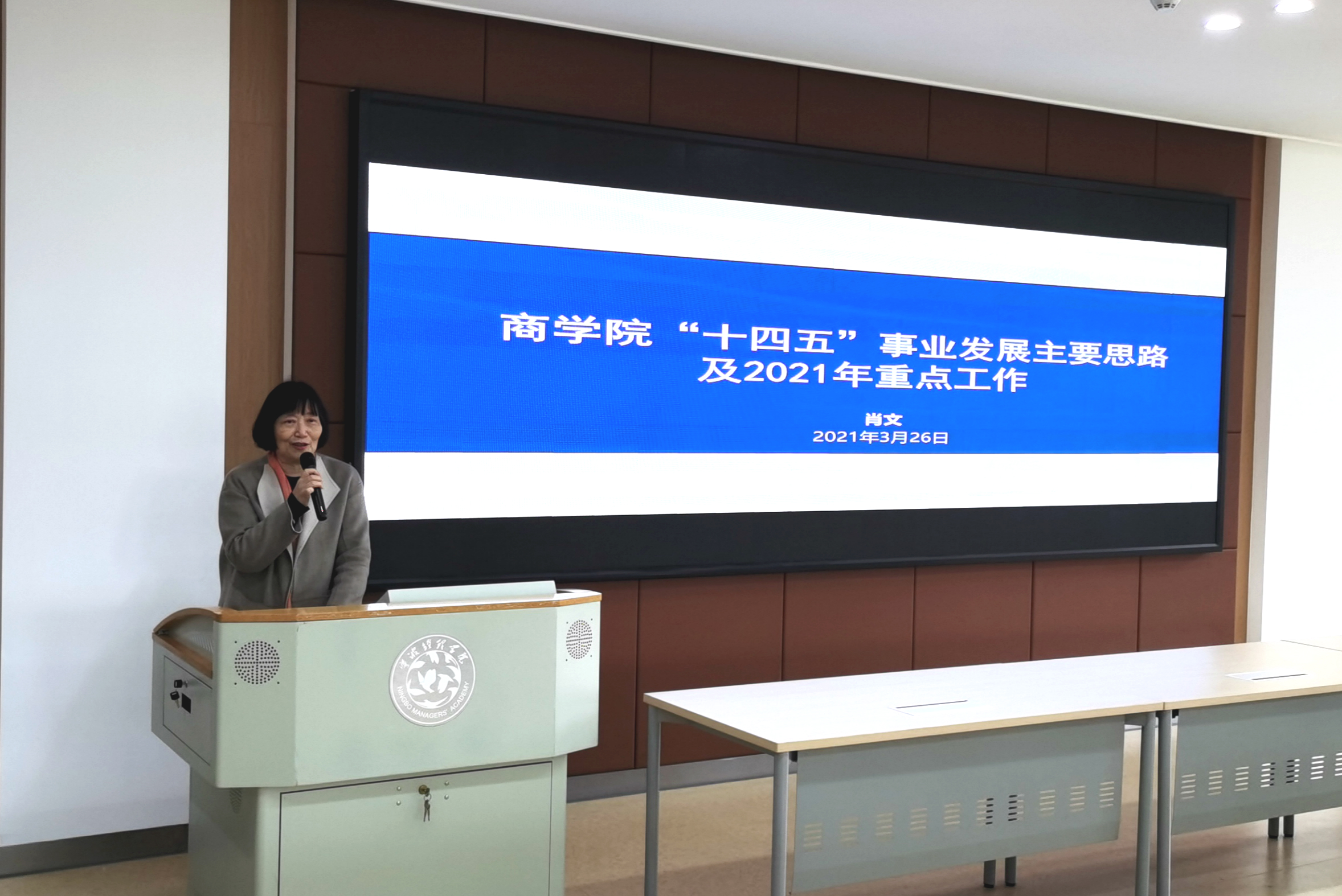 学院院长肖文介绍了学院“十三五”规划指标的完成情况,重点对学院“十四五”规划制定的背景、主要特点、发展目标、重点举措和支撑保障等进行详细解读,明确“十四五”期间学院将坚持特色发展、交叉融合发展、阶梯发展的原则,以“数字经济与管理”为方向凝练特色,深入参与学校“智慧化港口与服务”交叉学科群建设,重塑学科科研优势、优化本科生培养体系。随后,肖文院长对2021年的六项重点工作进行了部署,并明确了工作责任分解和进度表,确保重点工作落实。