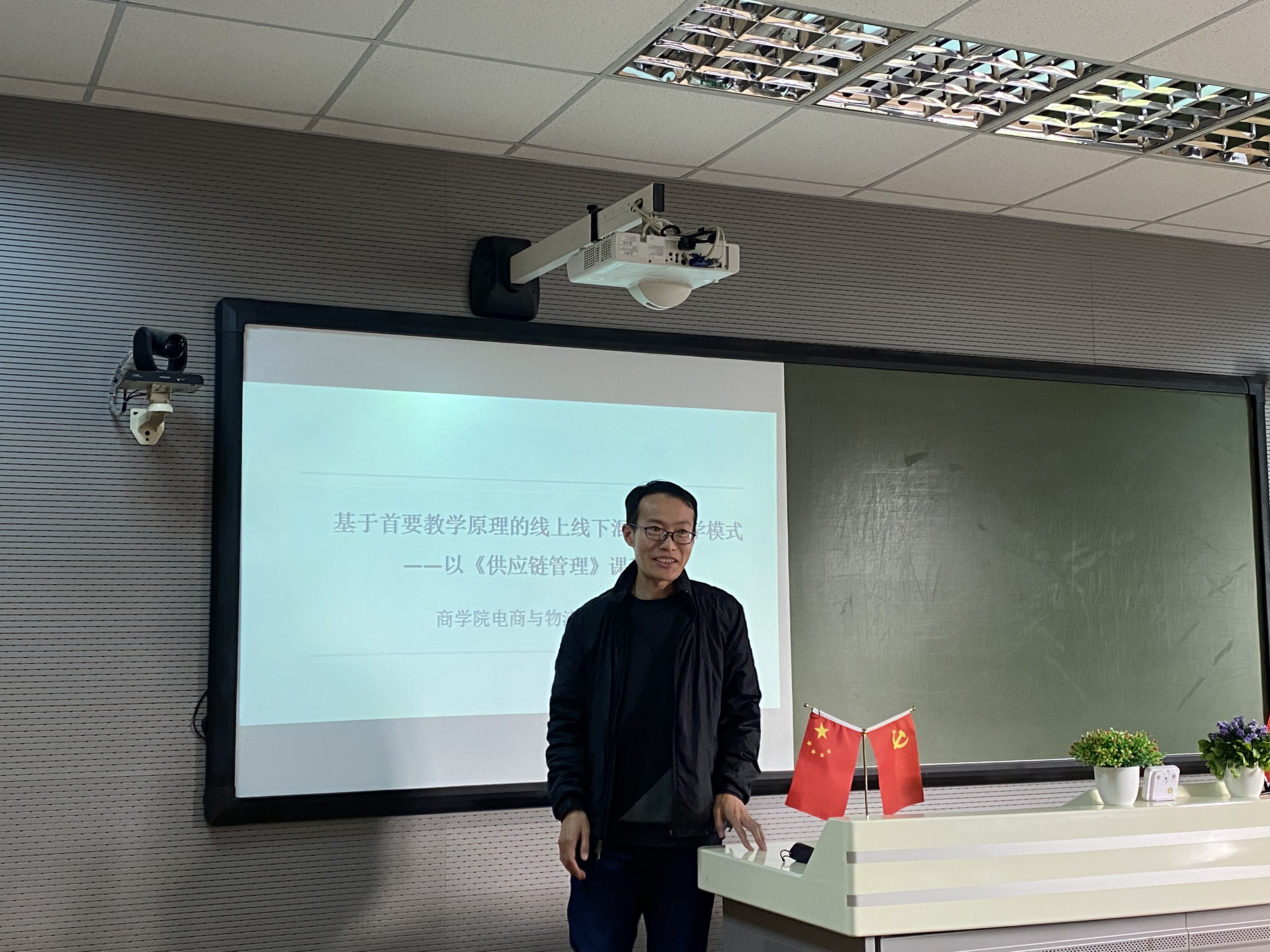 会议第二个阶段由教工电商物流党支部书记周春华老师主持,葛洪磊、董新平两位老师分别就一流课程建设和产教融合发展进行了分享交流。葛洪磊老师分享的题目是“基于首要教学原理的线上线下混合式教学模式—以《供应链管理》为例”,从教学理念、首要教学原理、教学模式设计、教材建设、教学实践等方面分享了六年来线上线下混合式教学模式探索和一流课程建设的成果和心得,在座老师们用热烈的掌声表达了自己听后的心声、感受和收获。董新平老师分享了电商专业与龙头企业、产业园区(基地)、行业协会组织、校友、地方政府部门等的产教融合合作,以及主动组织区域知名企业合作的不懈探索,并就电商专业产教融合理念形成、基地建设与组织、学生实践实战、校友倾情支持等方面进行了热情洋溢的心得感受分享。在座老师们深深地感受到了董老师对产教融合的热情投入、不懈追求和对电商学子从中获得的长足成长感溢于言表的自豪感。