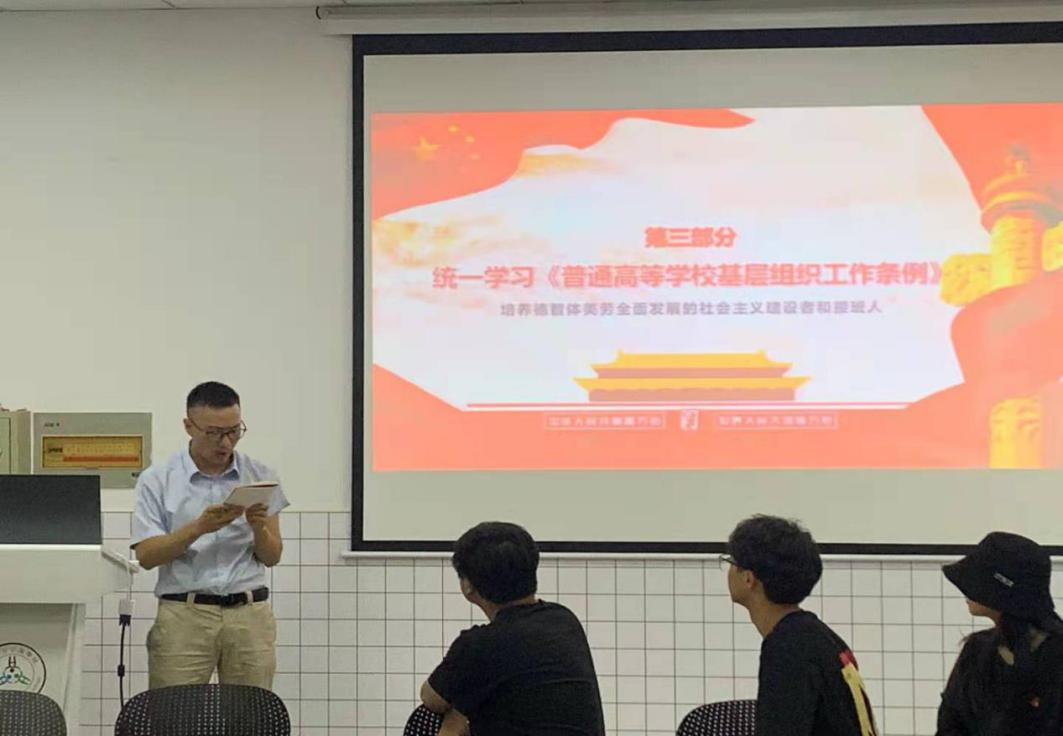 (九)6月1日下午,商学院教工行政党支部在SC415会议室召开支部大会,专题学习修订后的《中国共产党普通高等学校基层组织工作条例》(以下简称《条例》)。支部书记王一程主持会议,围绕深刻认识《条例》修订的背景、过程和重大意义、准确把握《条例》几个重大问题等方面,带领全体党员原原本本学习修订后的《条例》,并以微党课形式对照新旧《条例》全文进行解读。会后,支部党员进行学习讨论,交流学习心得。