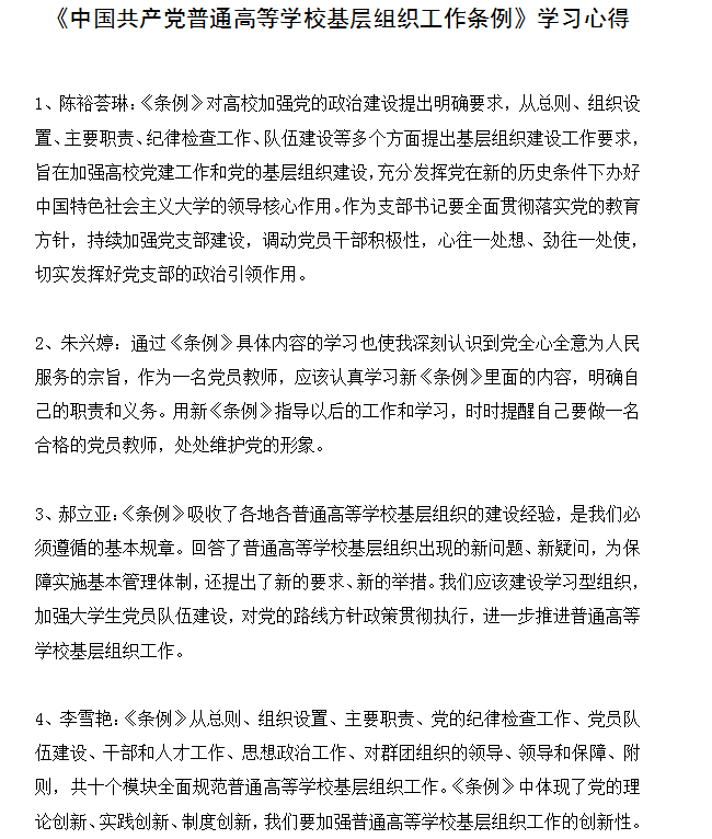 (八)教工金融与贸易党支部通过线上学习+线下讨论的方式推进《普通高等学校基层组织工作条例》的学习,支部党员通过撰写学习心得,分享自己的所学所思所得。