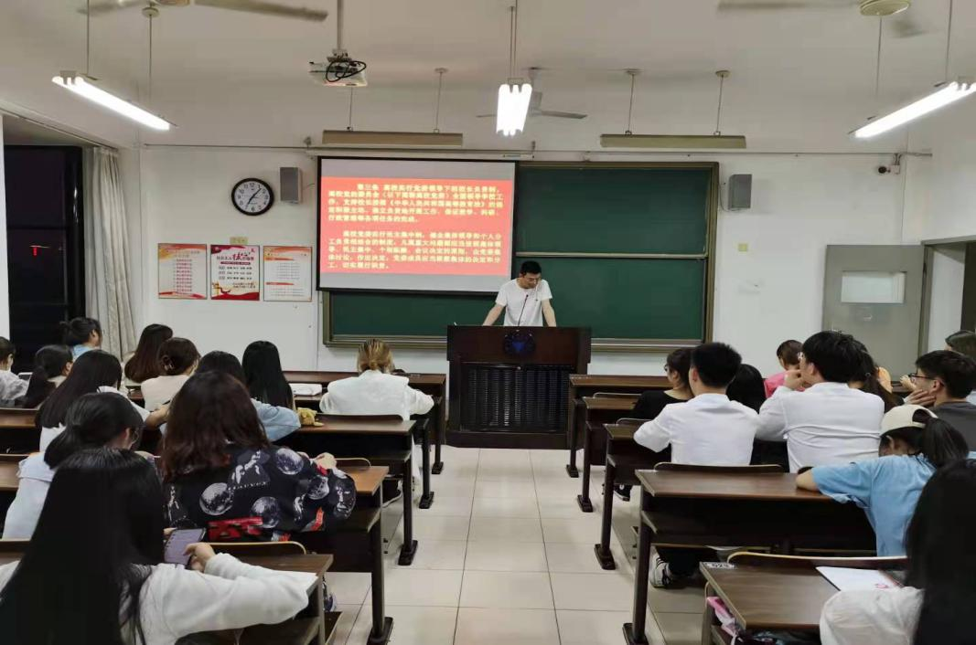 (十一)6月21日晚,商学院学生国贸专业党支部在SC415召开支部大会,学习《中国共产党普通高等学校基层组织工作条例》。支部书记潘剑邦结合支部工作实际,重点围绕学生支部建设要求,逐条学习《条例》,希望学生党员能理解工作要求,重视支部建设。