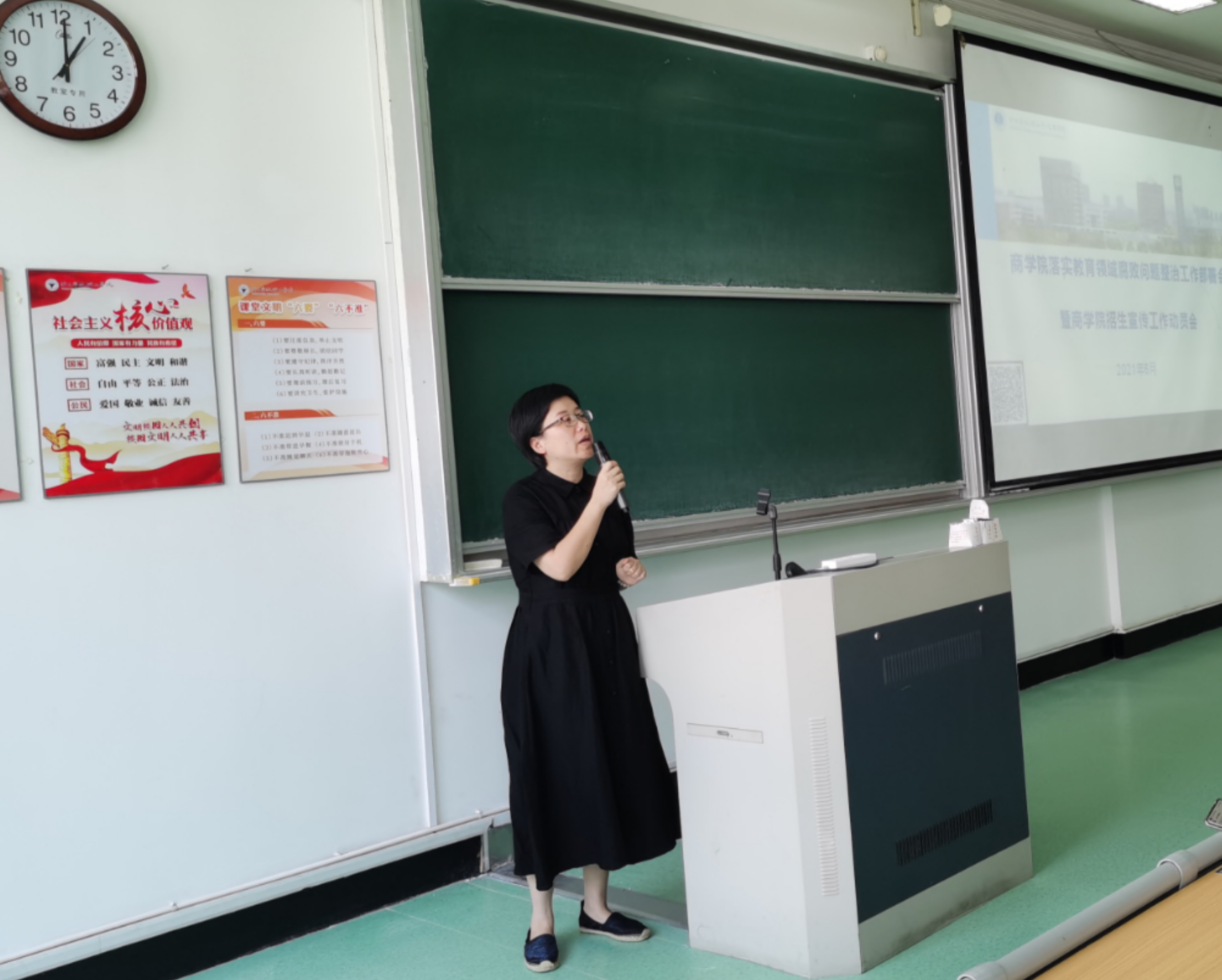 针对学期末相关工作,周丽娟副书记对学院考风考纪教育、暑假安全和军训等方面的工作做了通报部署。教务主管王一程对招生宣传的责任片区划分、工作人员组成及相关工作进行了介绍和提醒;并对学期末试卷领取和批改等注意事项进行了说明。