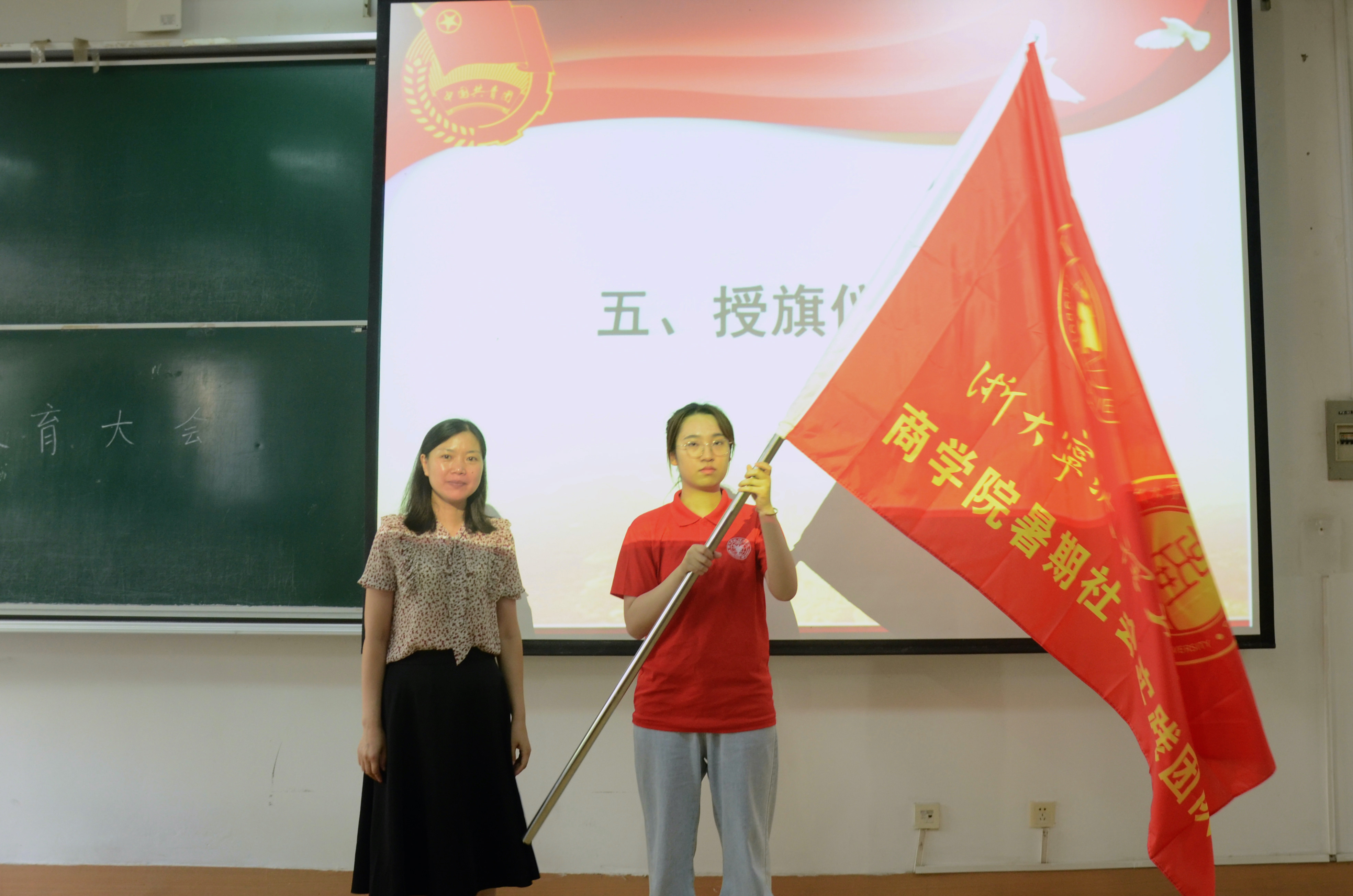 接着,“甬心甬动”队长姜可欣作为出征代表进行发言,并宣读安全承诺书。周丽娟老师为队长代表姜可欣授旗并合影。