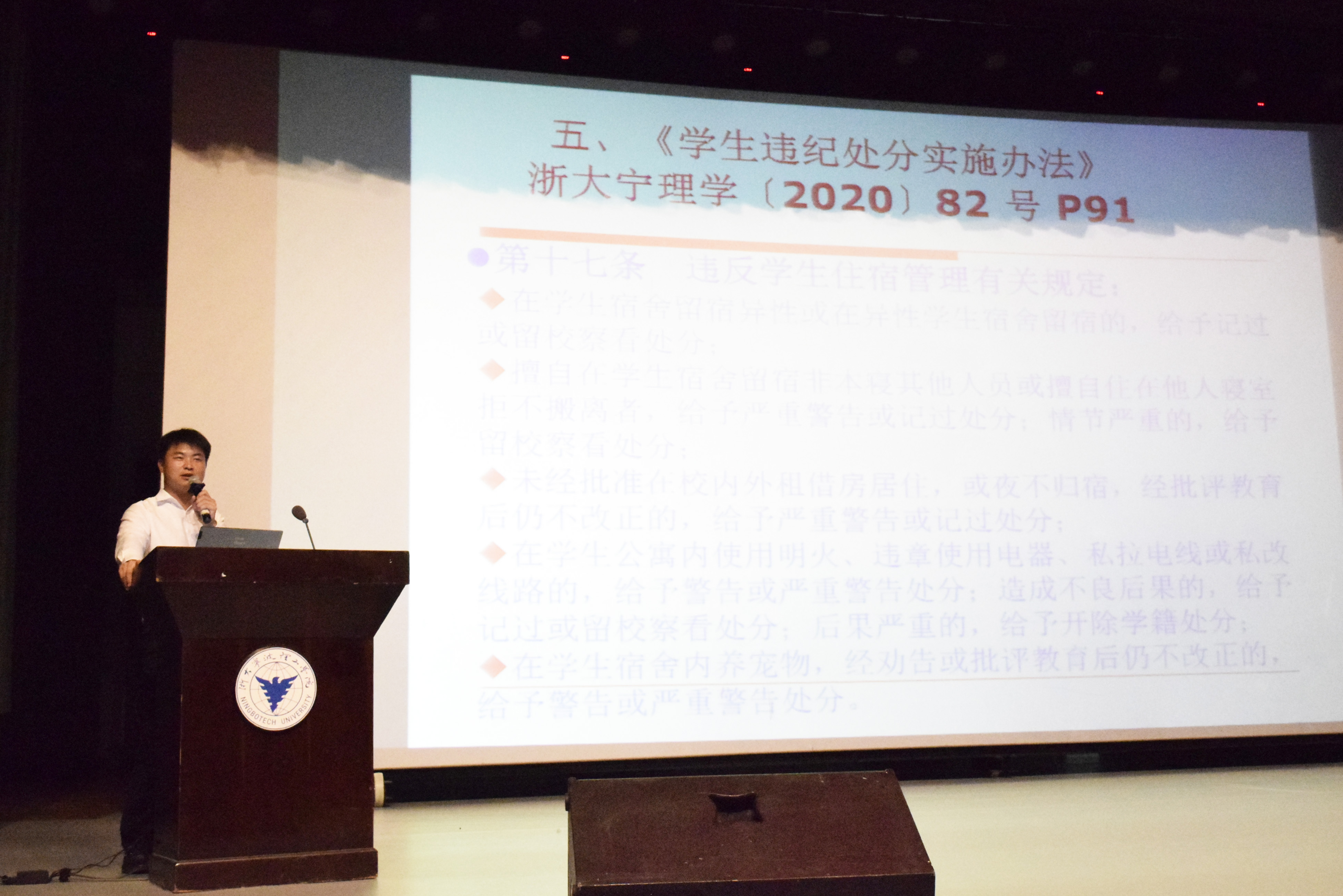 学工办赵昌志老师开展规章制度讲解,他从学生日常行为管理、学风纪律要求、学生奖助学金评定、考风考纪、违纪处分等方面,详细分析和讲解了《学生手册》中的有关规定,特别强调了疫情防控期间的要求,为新生今后规范有序的学习和生活提供了方向指南。