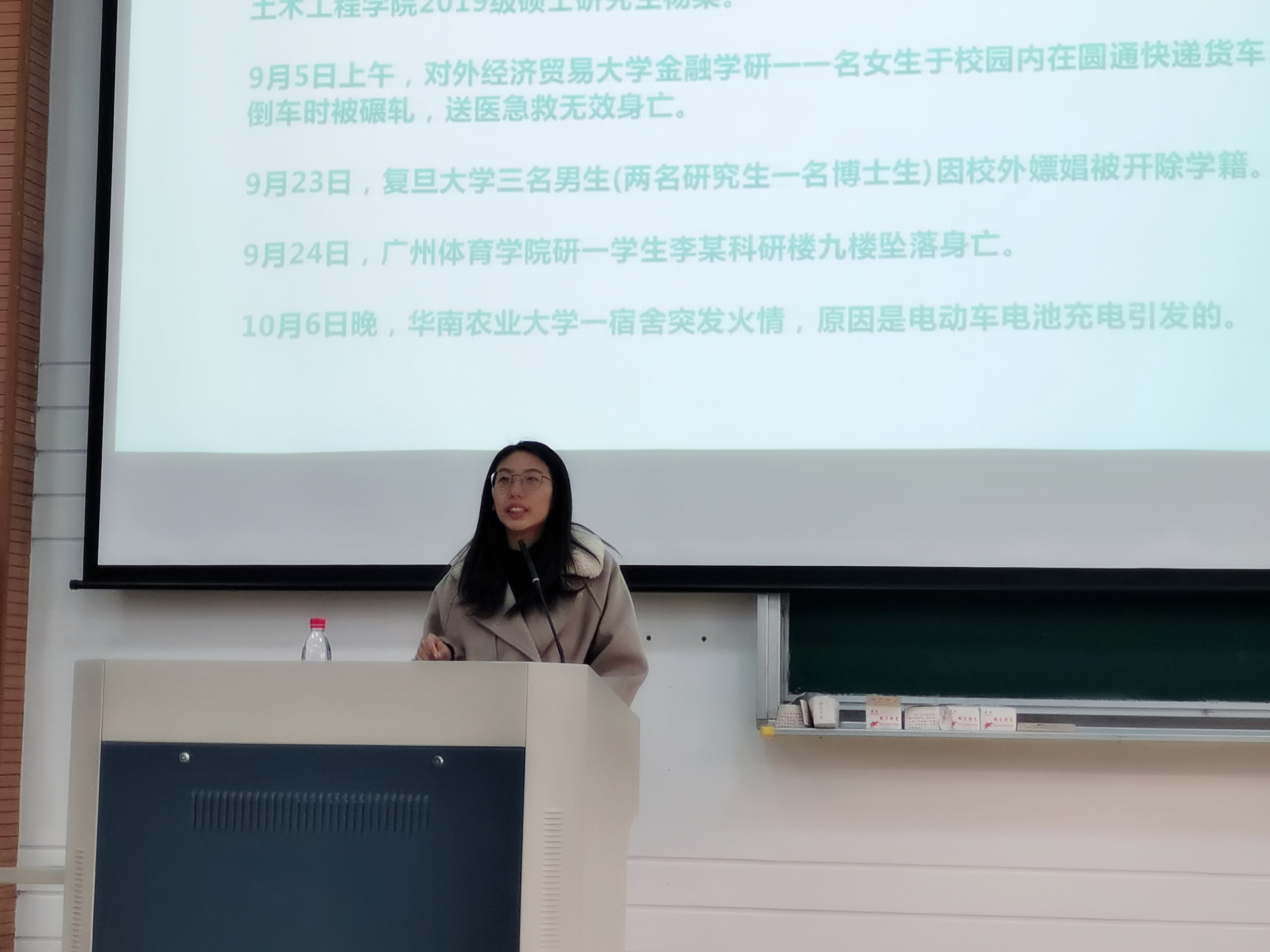 保卫处蔡浩婕老师从毕业生人身安全、校园安全和职业安全三个方面给同学们做了毕业安全教育,她希望同学们在安全就业的过程中做好自我安全教育和管理,平安毕业,安全就业。