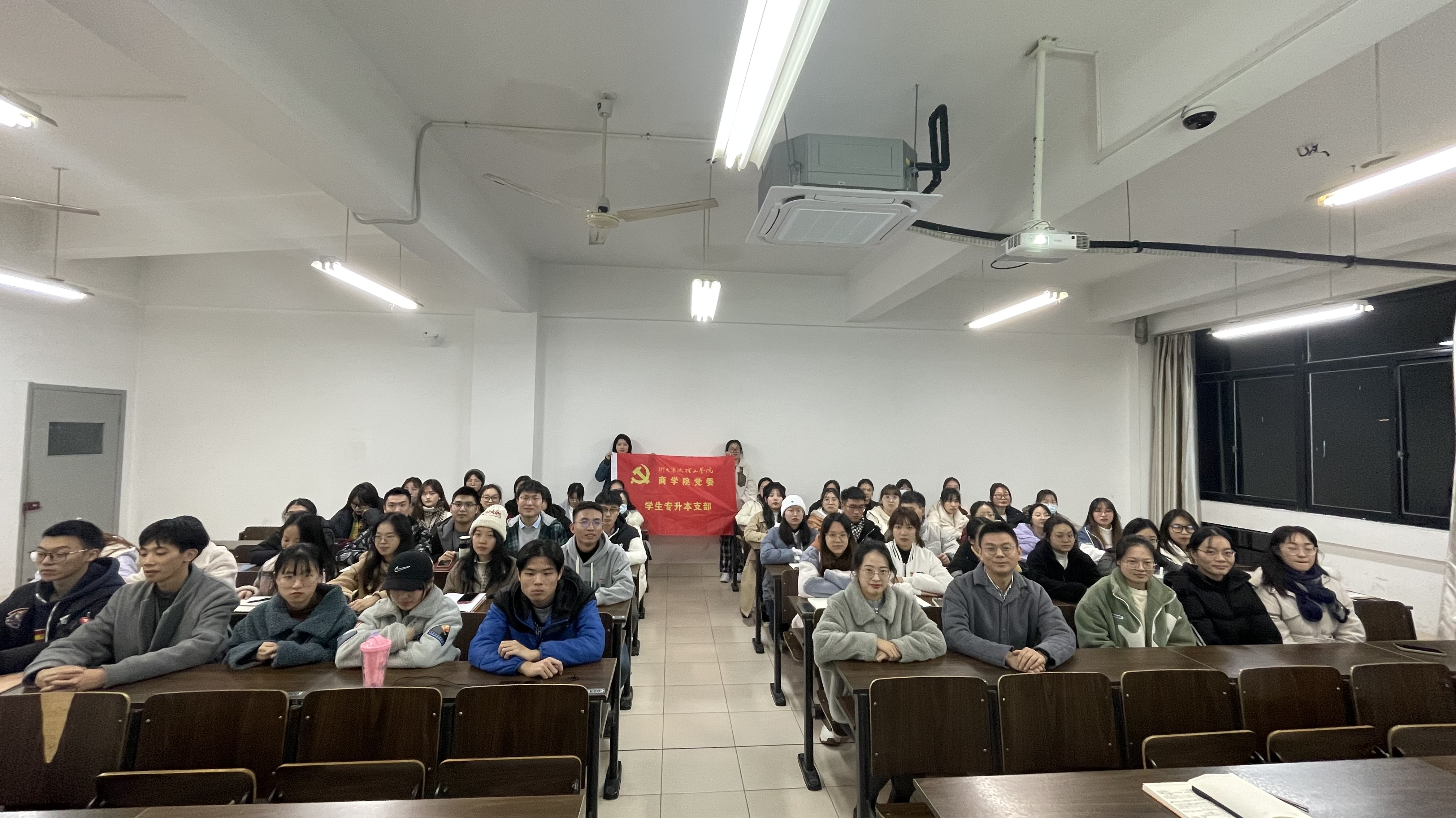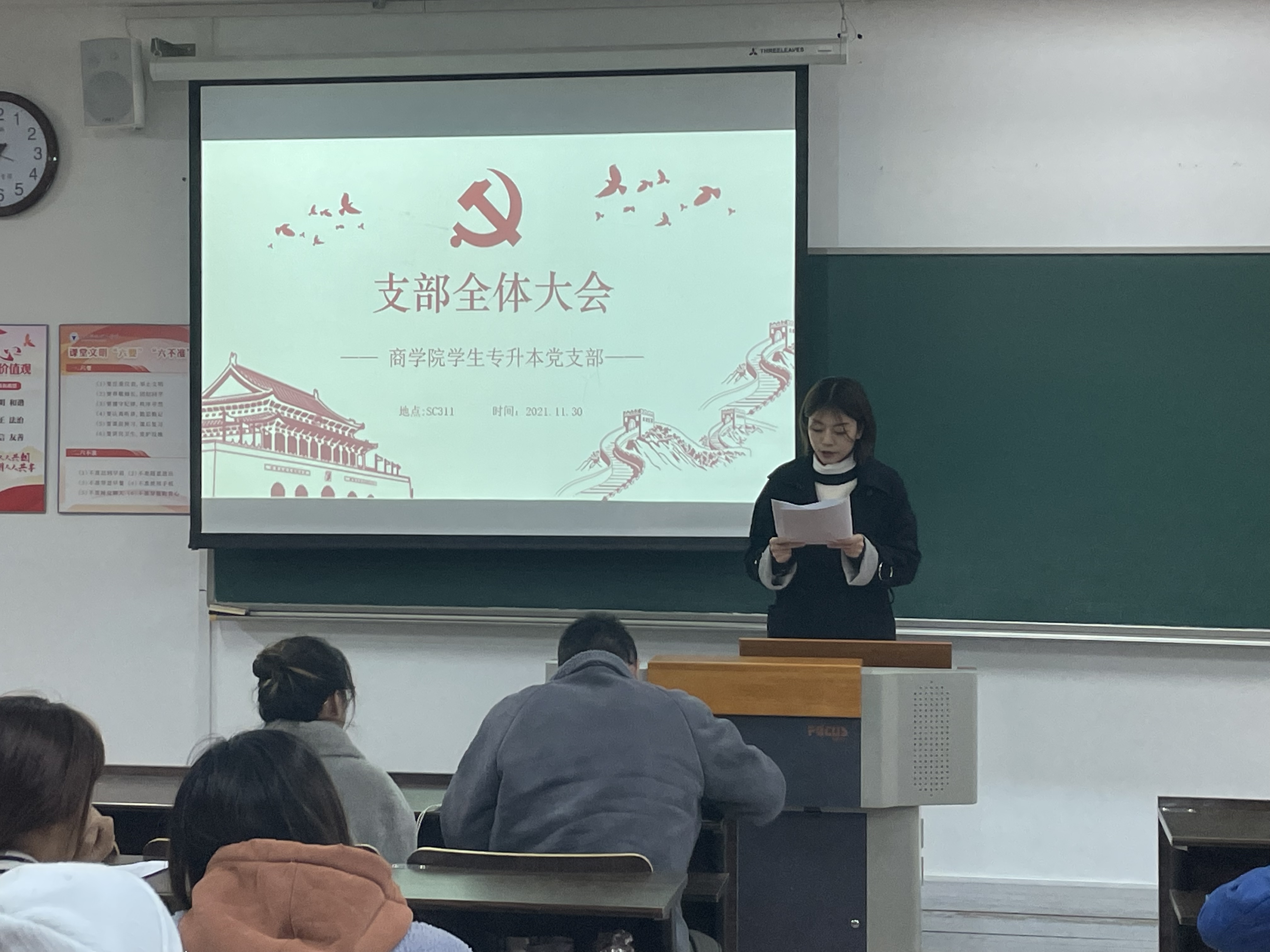 2021年11月30日晚上18:30,商学院学生专升本党支部在SC311教室召开党员大会暨党的十九届六中全会精神专题学习会,会议由支部书记陈鑫同志主持,辅导员王幸媛同志及支部全体党员参加会议。