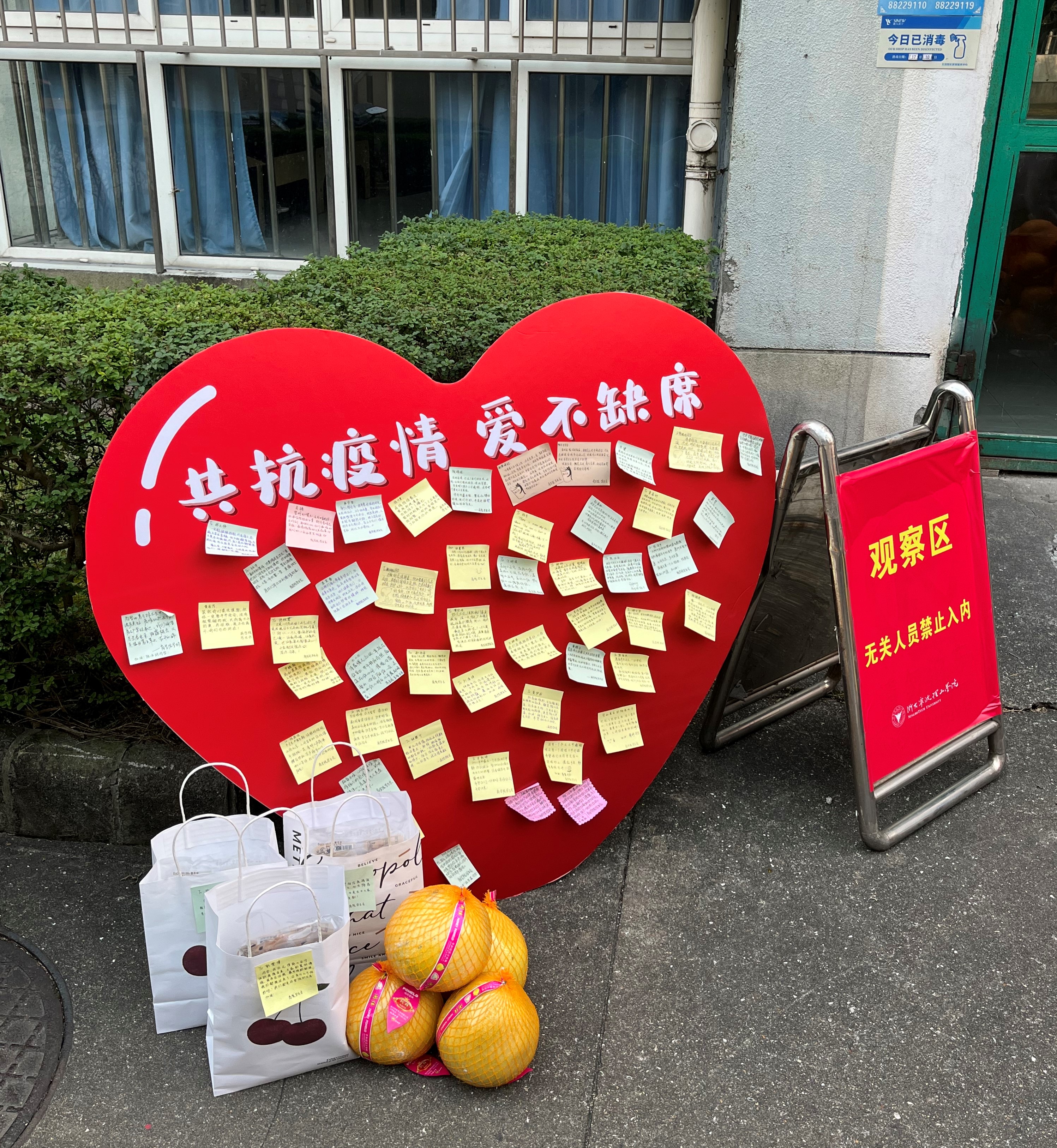 商学院从不缺少的就是爱。12月10日的30幢楼下,商院学生会为商院居家观察的同学送上温暖的祝福和慰问的物资,寒风吹散了秋日的果香却吹不散商院温暖的心。一袋袋温馨的物资,一颗颗金黄的柚子,一张张包含温情的祝福,是商学院最真挚的祝福,也是商院对居家观察的同学的期盼,希望他们能身披阳光,满怀希望度过这14天的居家观察。同时,学生会也准备了一个充满爱的展板,上面贴满了同学们的美好心愿以及真挚的祝福。此次活动完美诠释了“共抗疫情,爱不缺席”的含义。面对疫情,我们不畏惧、不退缩,不会落下每一个同学。疫情之下,我们每个人众志成城,共同抗击,让爱传递在每个人的心中。让每个同学都能在寒冷的冬天感受到来自学校的温暖。