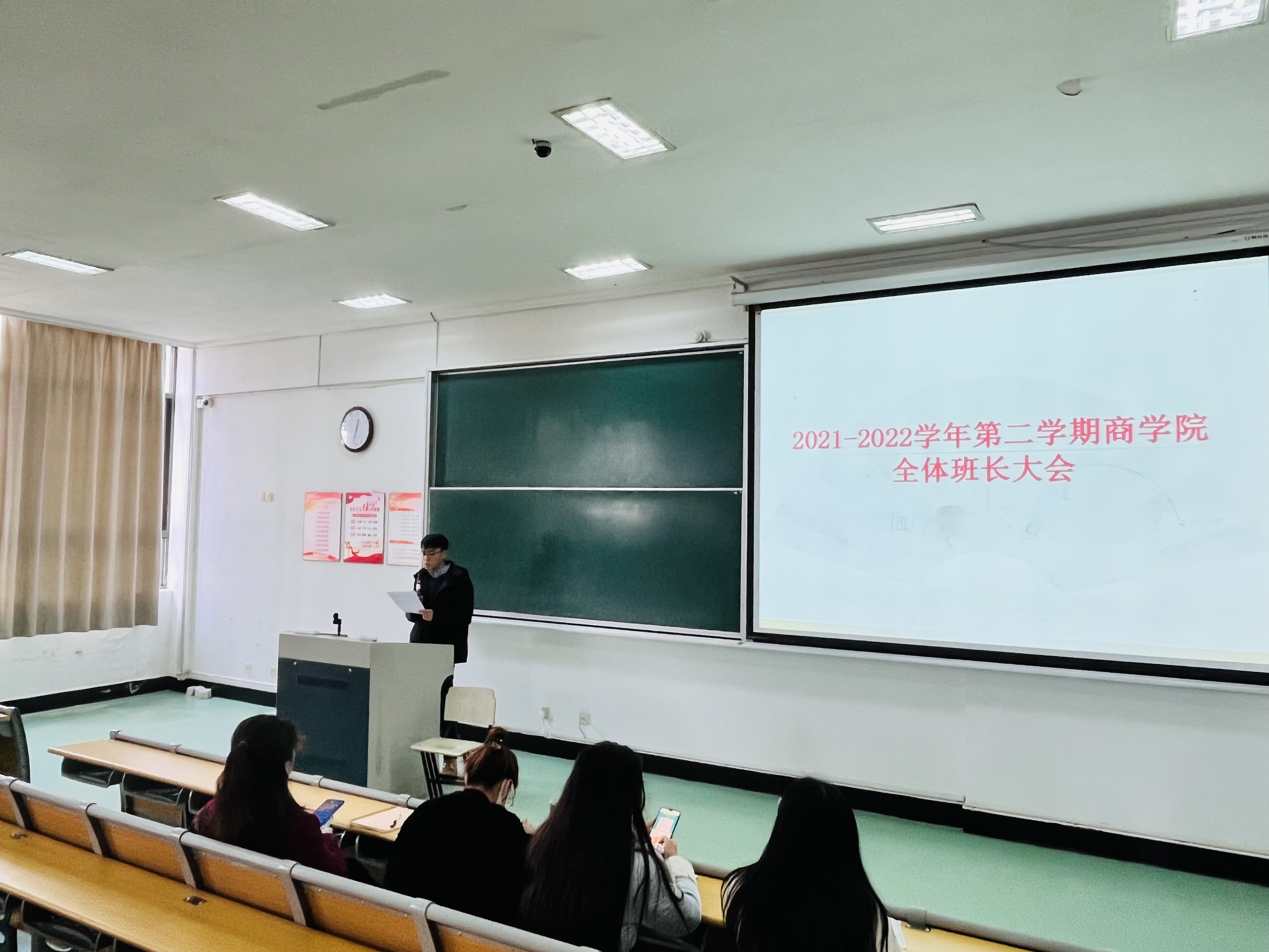3月4日中午,商学院于SC218召开新学期班长会议,学工办潘剑邦、王丽丽、王幸媛、任紫君,学院国际交流中心陈妍颖,学院全体班长参会,会议由学工办副主管潘剑邦主持。