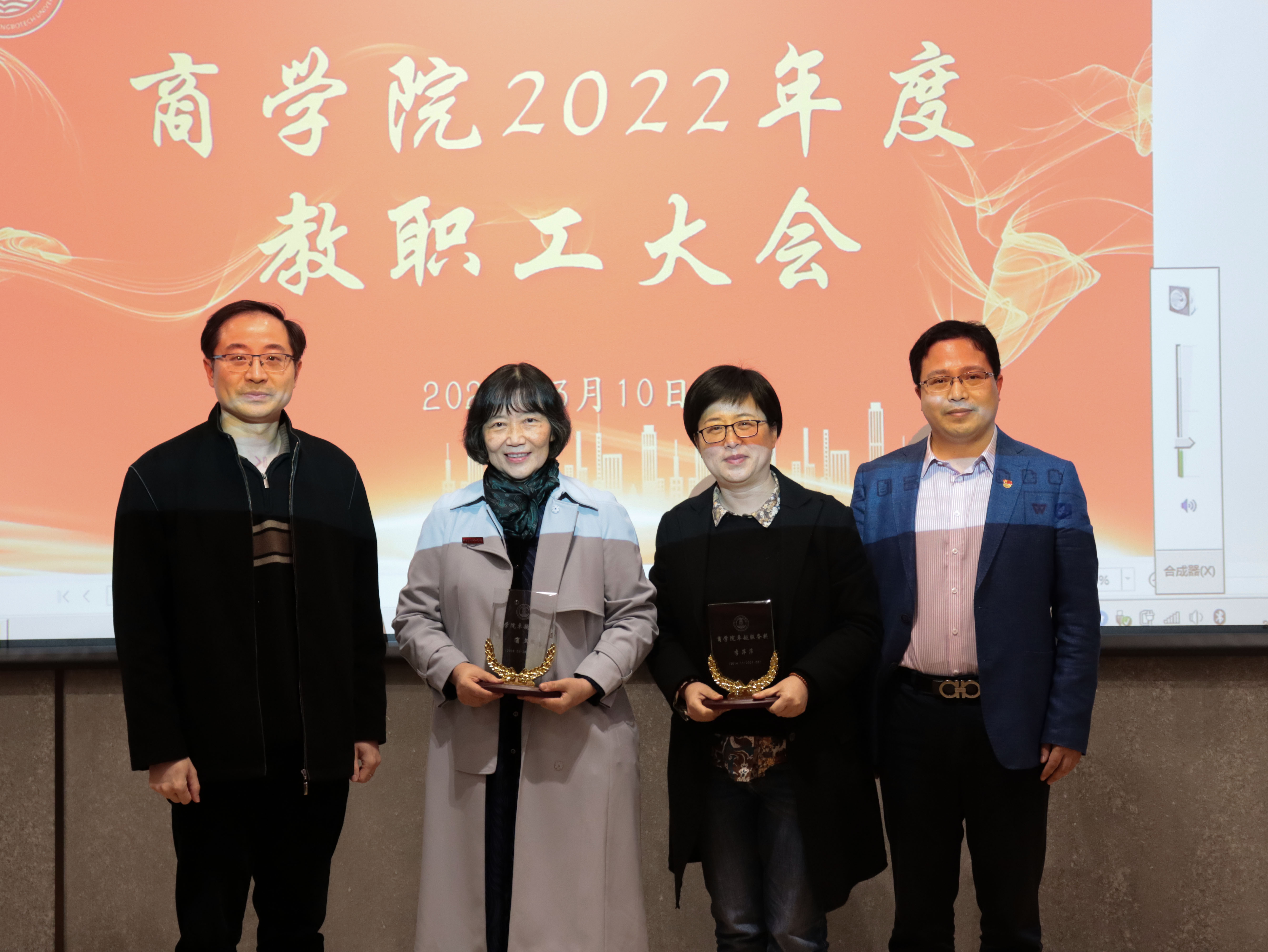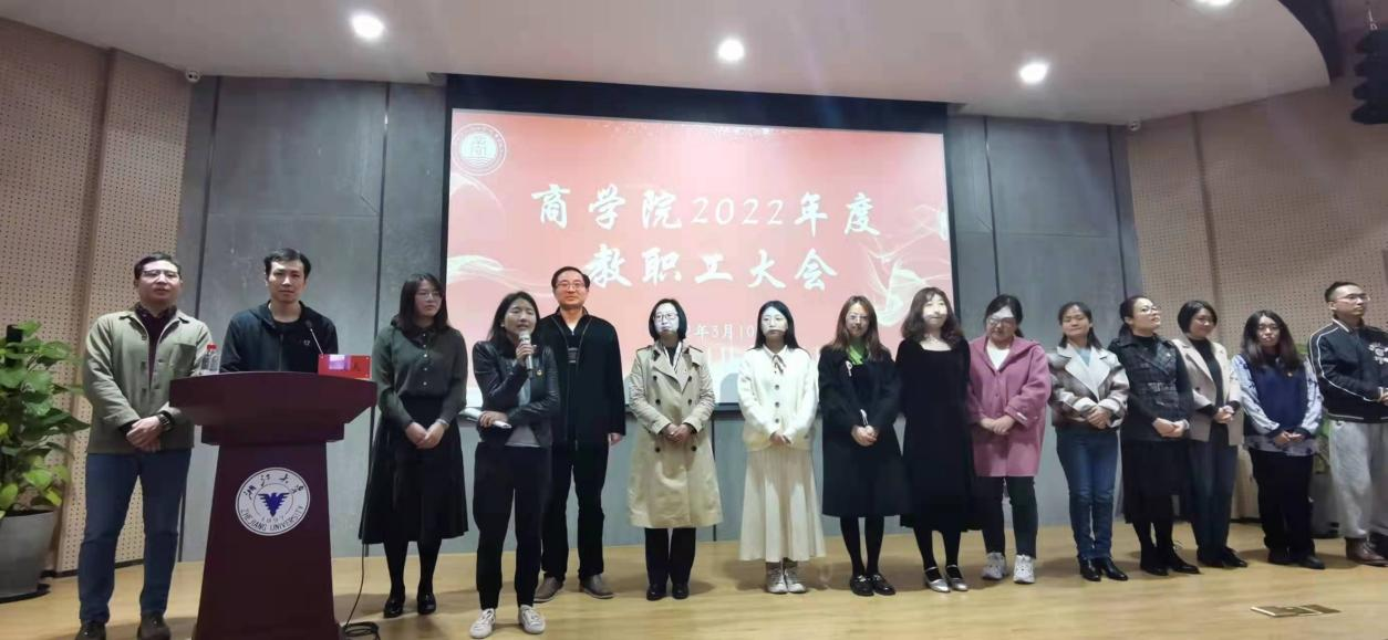 2021年商学院各方面取得了显著成绩,被学校综合绩效考核为A,是学院新老班子和全体教师共同努力的结果。会议举行了隆重的表彰仪式。院长苗青为学院老领导肖文、李萍萍、周丽娟颁发卓越服务奖,感谢他们长期以来为商学院做出的贡献!