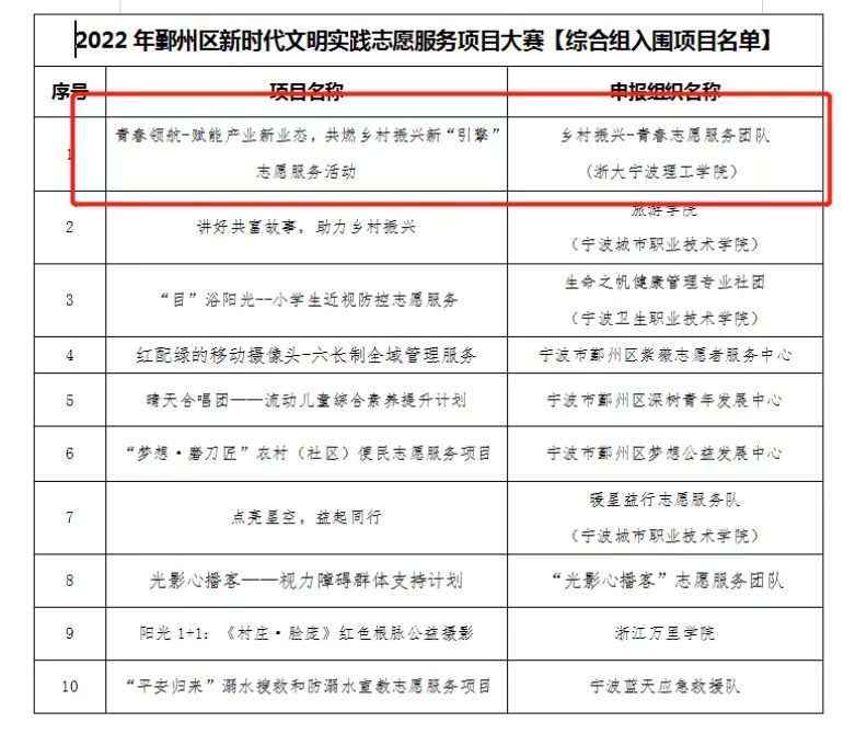 4月25日,经过专家层层选拔,2022年鄞州区新时代文明实践志愿服务项目大赛初评结束,20个各具特色的志愿服务项目新鲜出炉。我院青春领航-赋能产业新业态,共燃乡村振兴新“引擎”志愿服务活动成功入围。