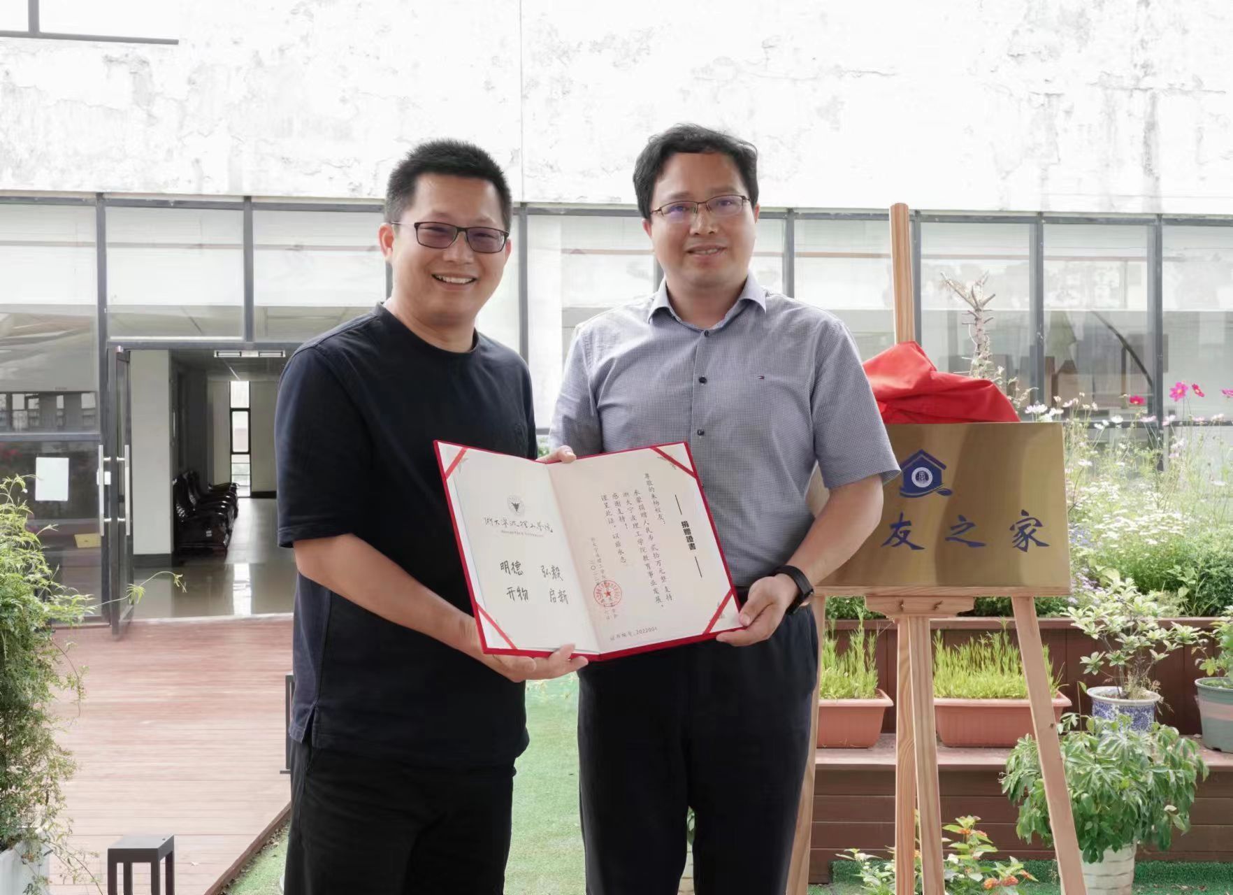 揭牌仪式上,黄光杰书记、朱杨校友共同为“校友之家”揭牌,林承亮书记为朱杨校友颁发捐赠证书,在校生代表向朱杨校友赠送学校纪念品。