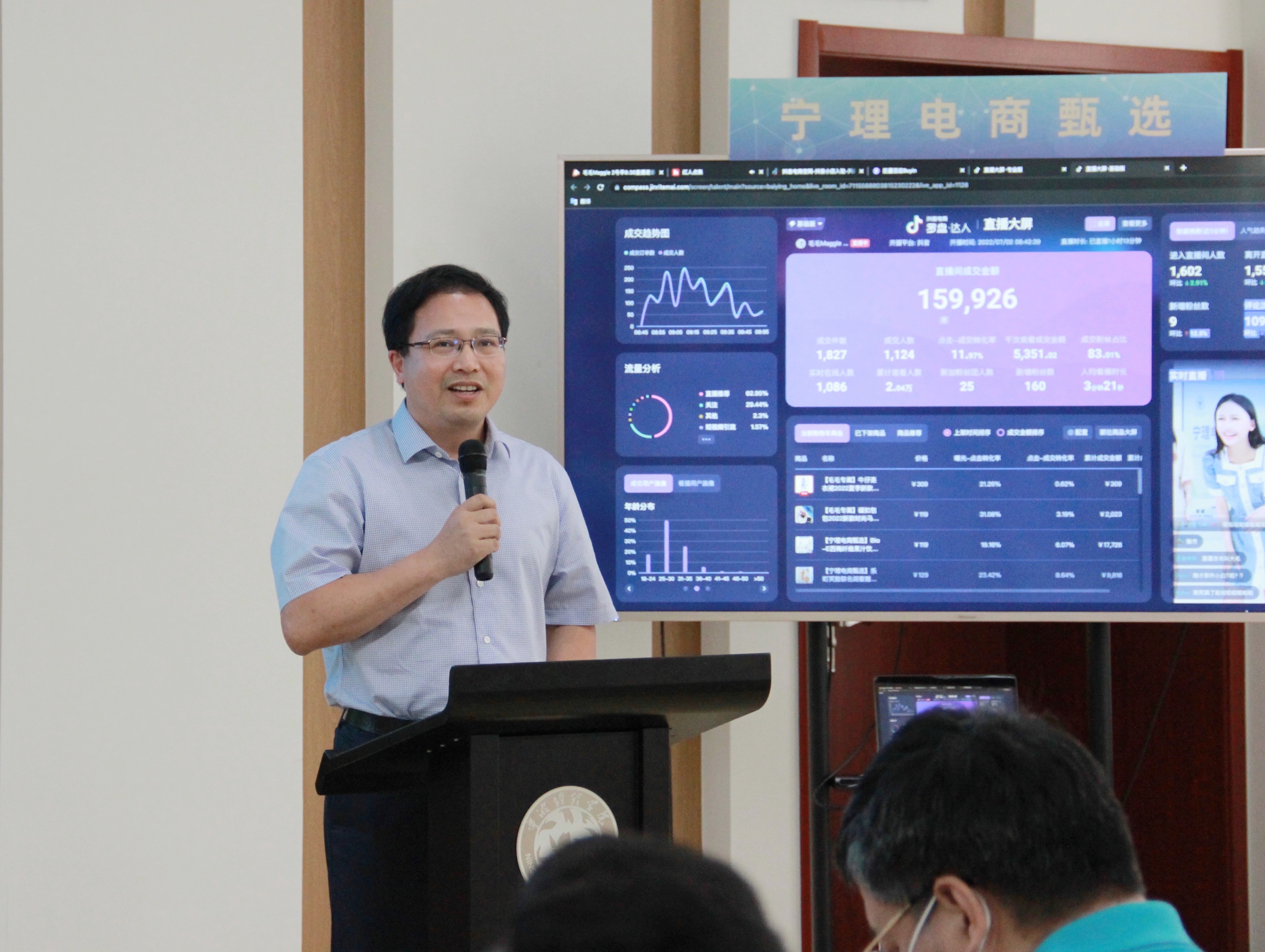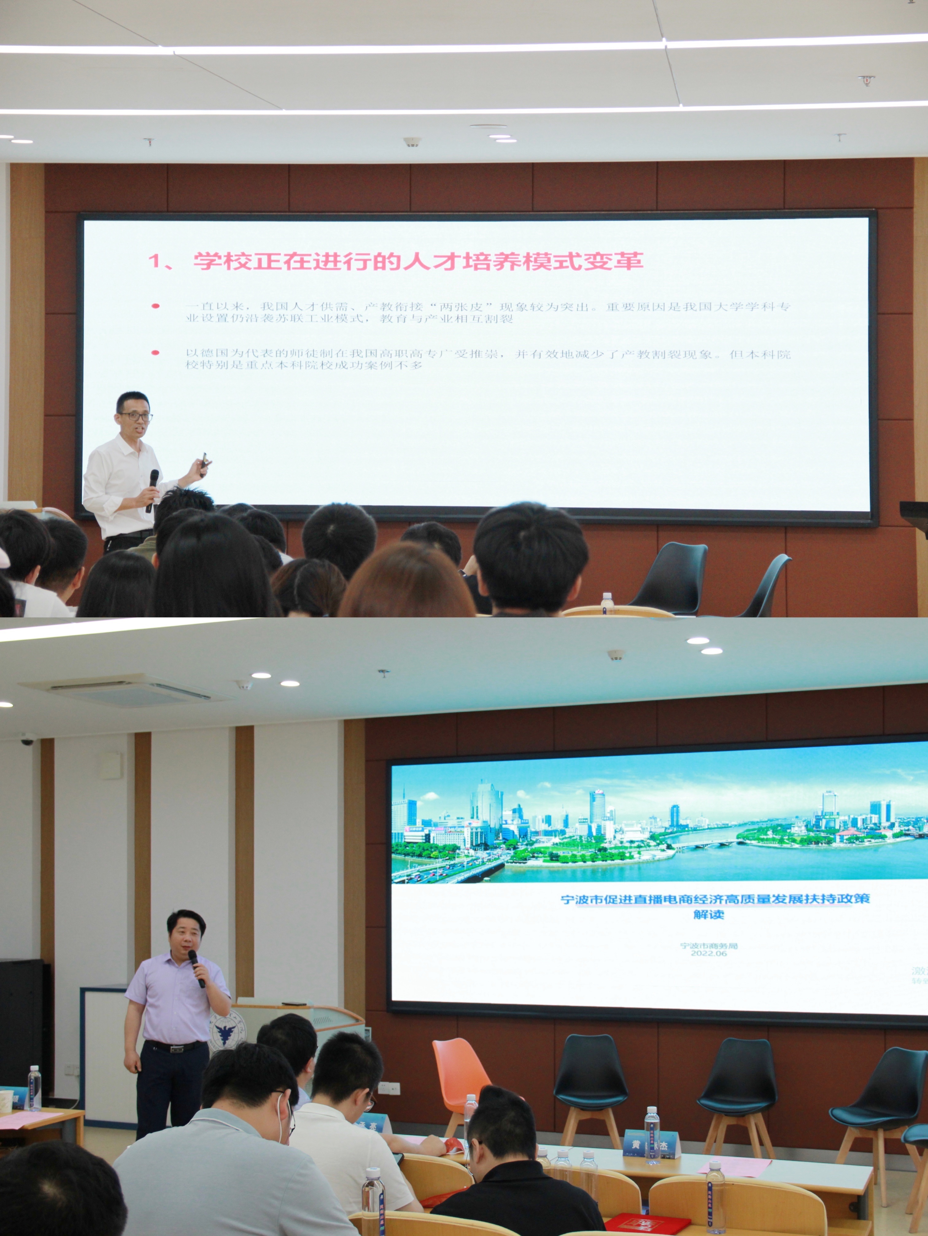 主题分享阶段有两位老师开设主题讲座。学校电子商务专业负责人董新平以及宁波市电子商务研究院互联网教育中心主任赵劲涛分别以《产教融合,助力校友发展》、《宁波直播电商政策分享》为题为大家带来了精彩的分享。