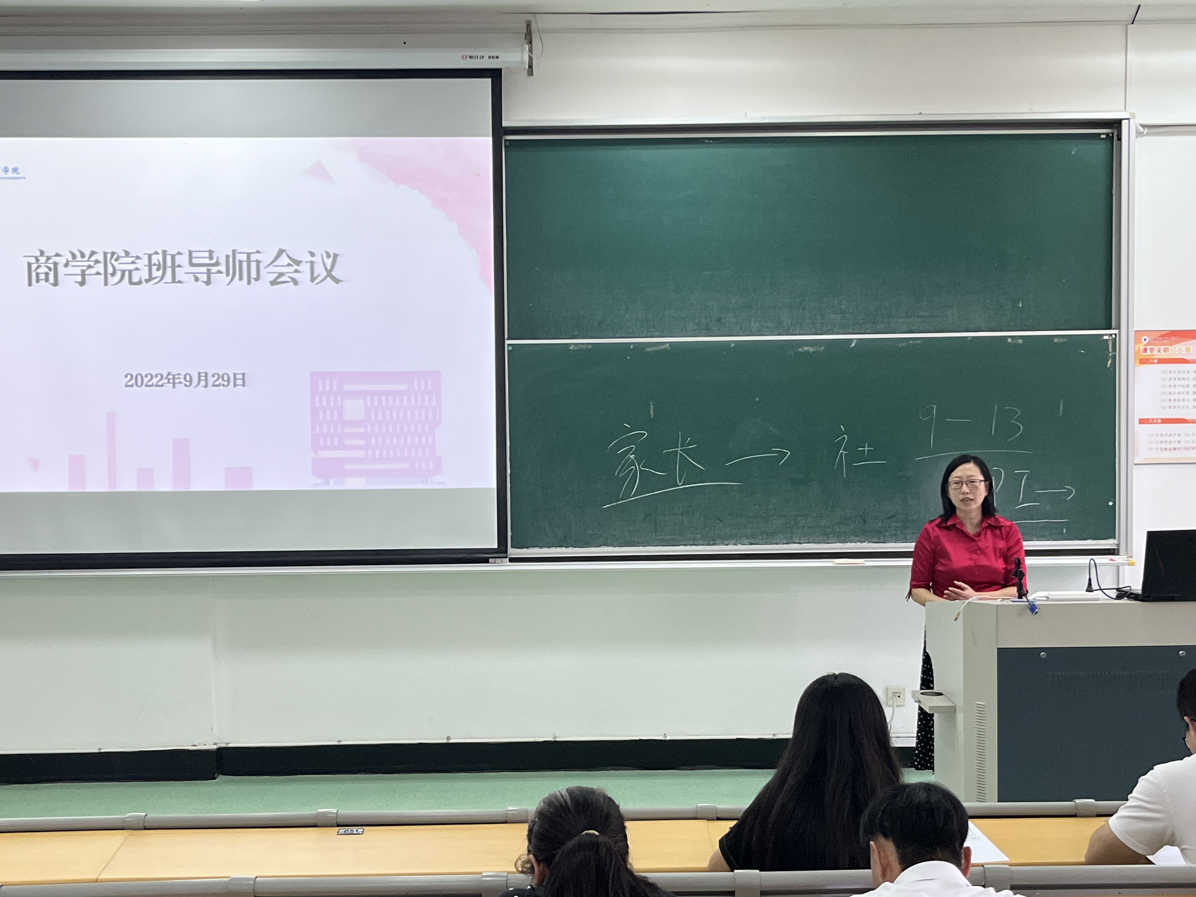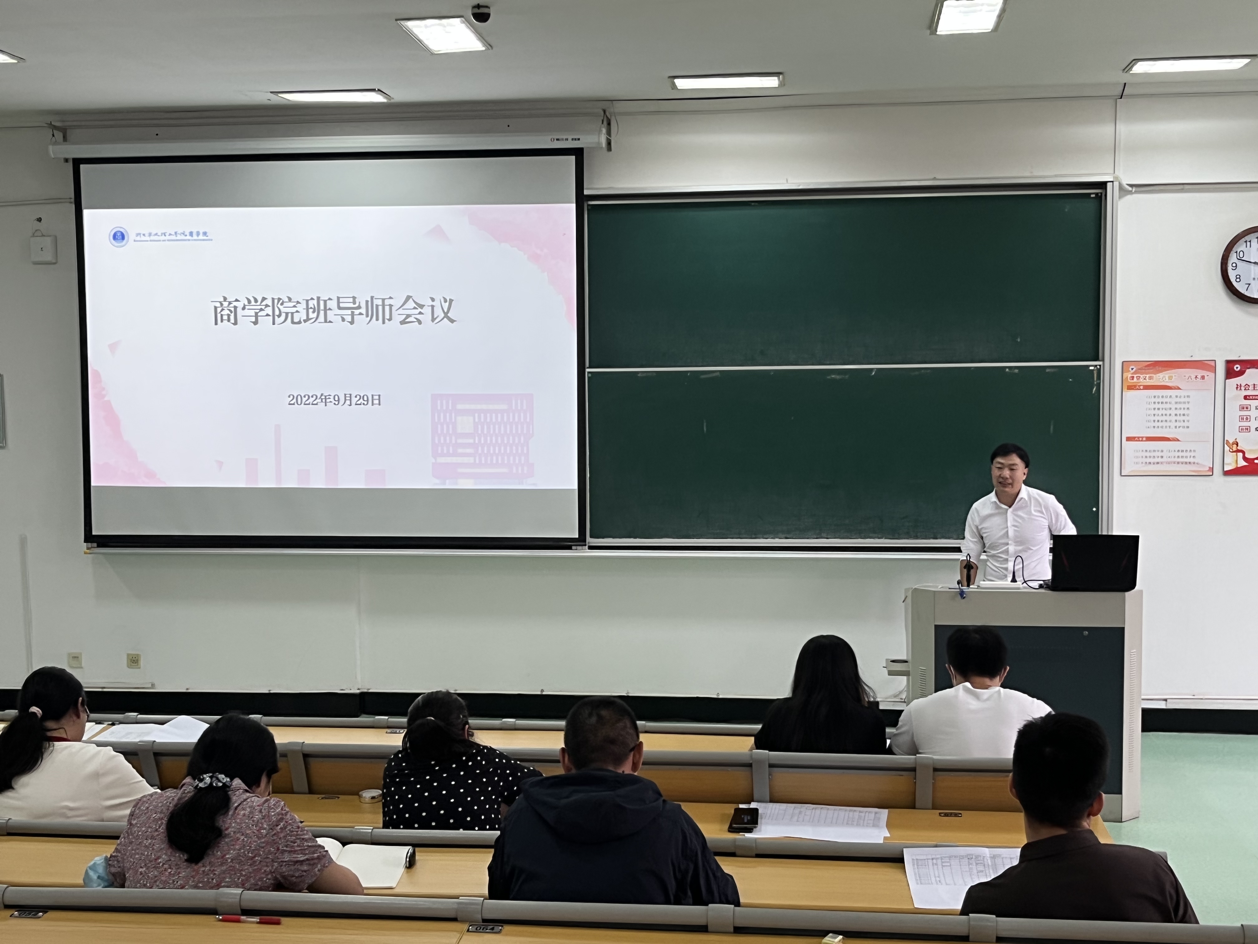 9月29日下午,商学院全体班导师会议于SC216召开。商学院党委副书记、纪委书记吴琼、学工办主管马双龙,副主管潘剑邦、学工办王丽丽、李渊、王幸媛、任紫君、张楚铭、田欣及商学院全体班导师参加会议。会议采用线上线下方式,由学工办副主管潘剑邦主持。