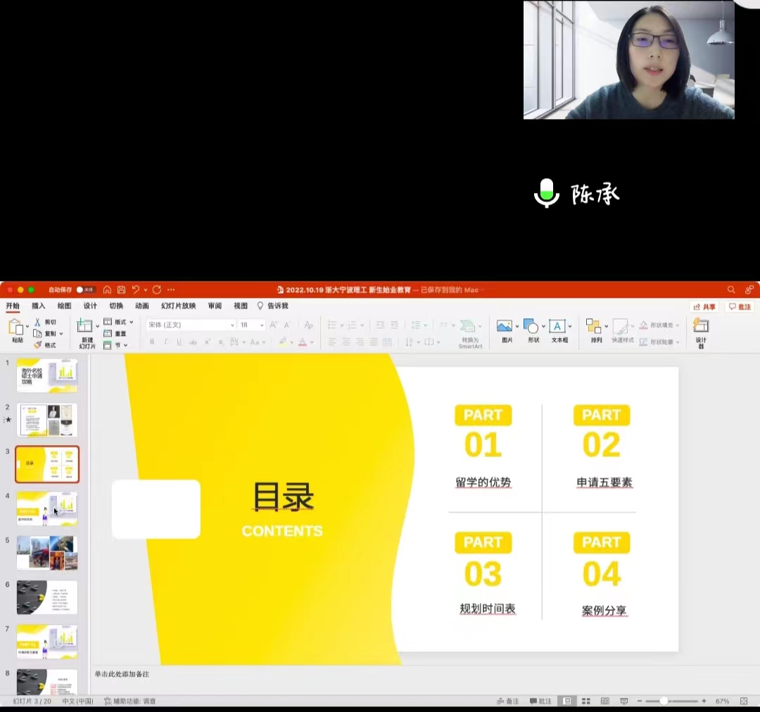 陈承老师从出国留学应如何规划入手,从留学的优势、申请五要素、规划时间表、案例分析四个板块进行讲解。陈老师分享自己朋友出国求学的经历,让同学们更加直观的感受到出国留学为个人发展带来的影响。陈老师建议同学们做好自己的成长规划,从大一开始备考四六级,大二明确自己的目标,大三备战雅思等,大四上递交申请,下获得录取、办理签证,一步一步靠近自己的目标。