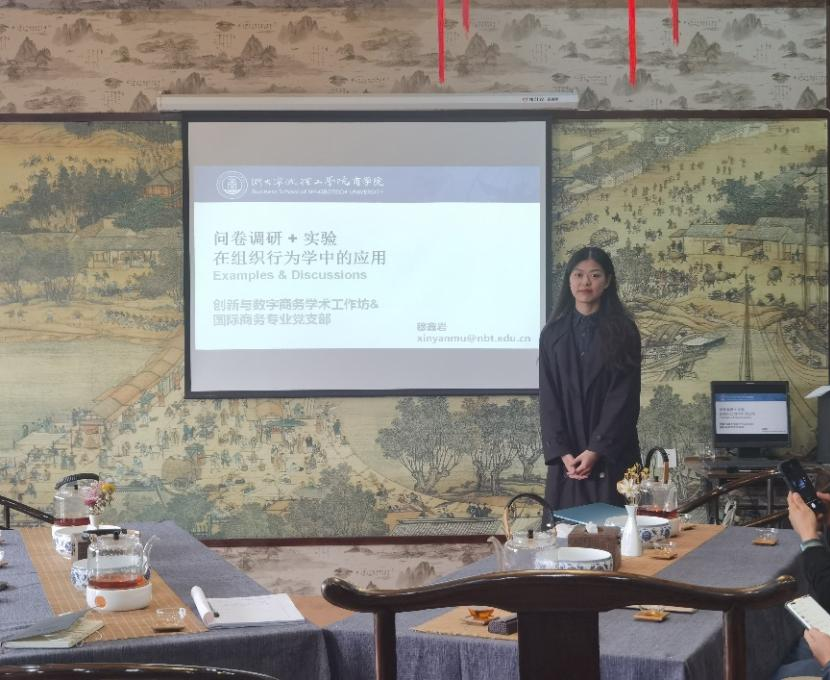 2022年10月12日中午,商学院“数字创新与商务”学术工作坊与国际商务专业党支部共同在“大益爱心茶室”开展了主题为“问卷调研+实验在组织行为学中的应用”的学术沙龙活动,本次沙龙活动由穆鑫岩博士汇报,商学院近20位老师参加了沙龙活动。