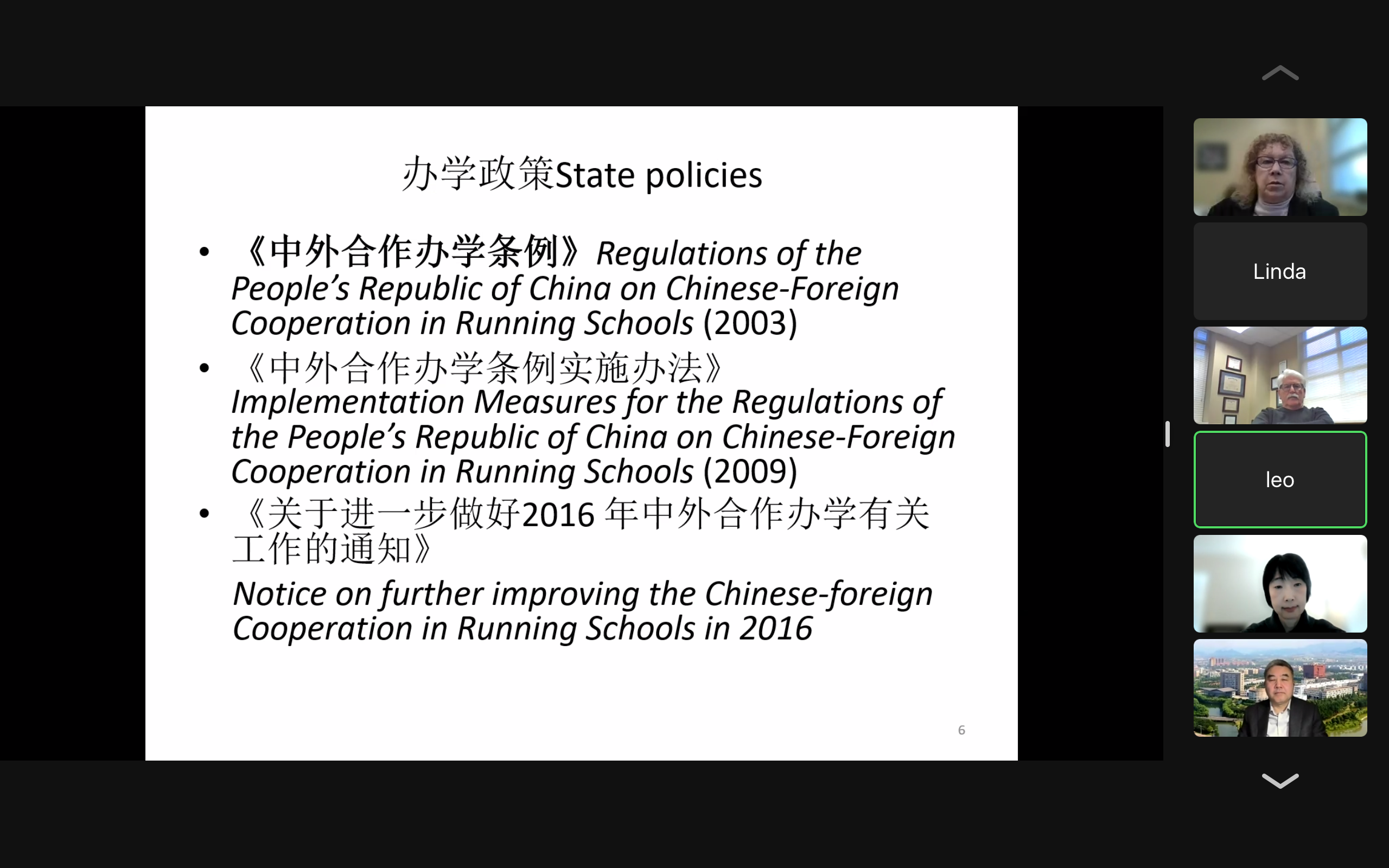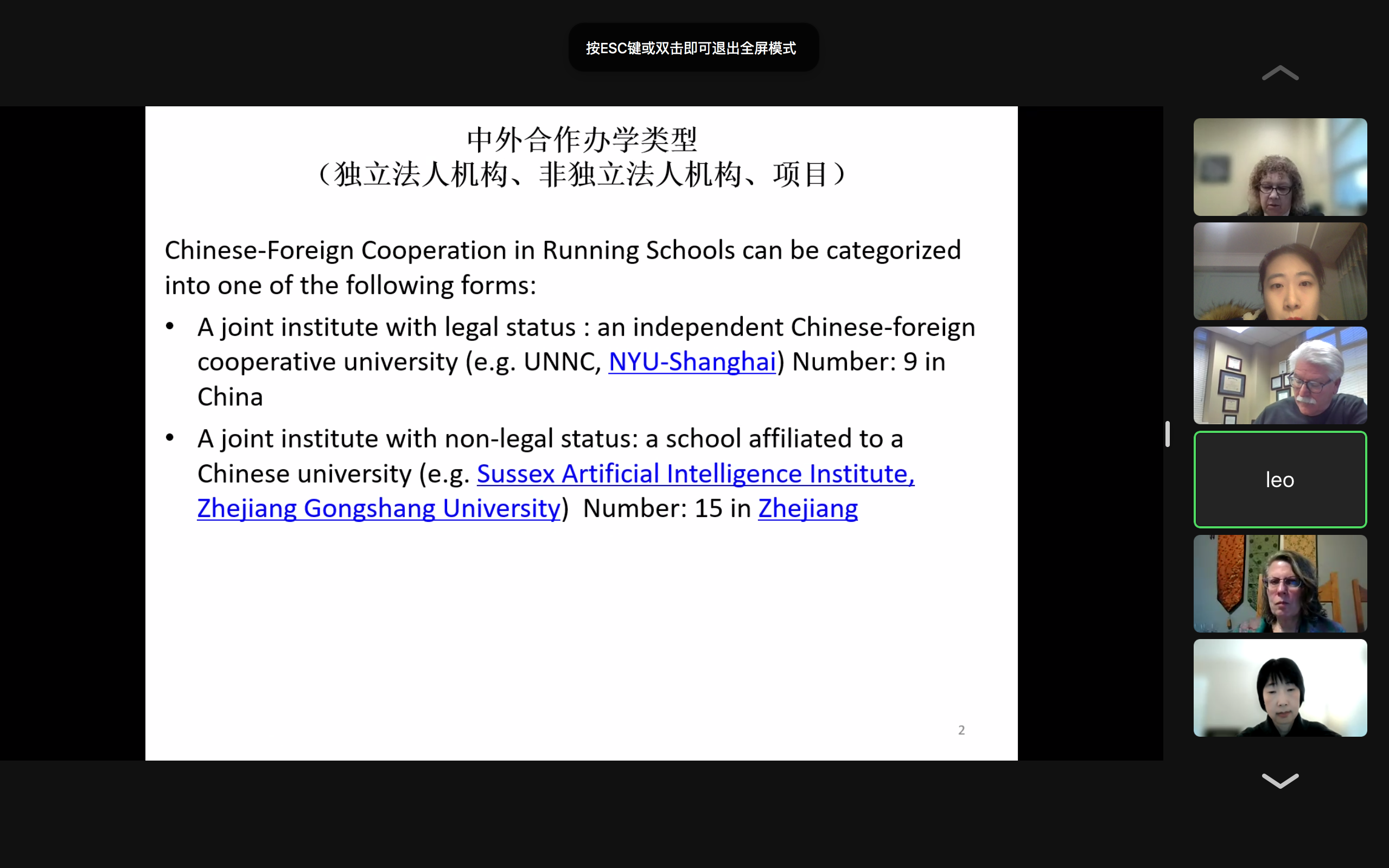 例会上,程萌副处长对中国目前存在的中外合作办学类型进行介绍,详细解读非独立法人机构的办学政策,以及中美合作项目目前需要改进的细节。