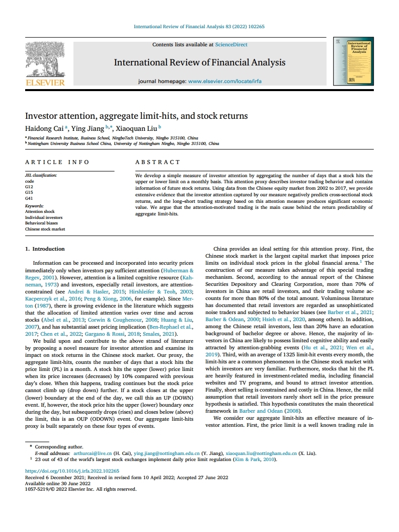 商学院青年教师蔡海东博士,作为第一作者发表的研究论文《Investor Attention, Aggregate Price Limits, and Stock Returns》,在金融领域重要期刊《International Review of Financial Analysis》第83卷(2022年)正式发表。根据JCR最新统计,《International Review of Financial Analysis》影响因子为8.235,属于金融类SSCI一区期刊,该刊也是金融领域国际公认的重要期刊。同时该文入围第三十三届亚洲金融学会年会并做宣讲。