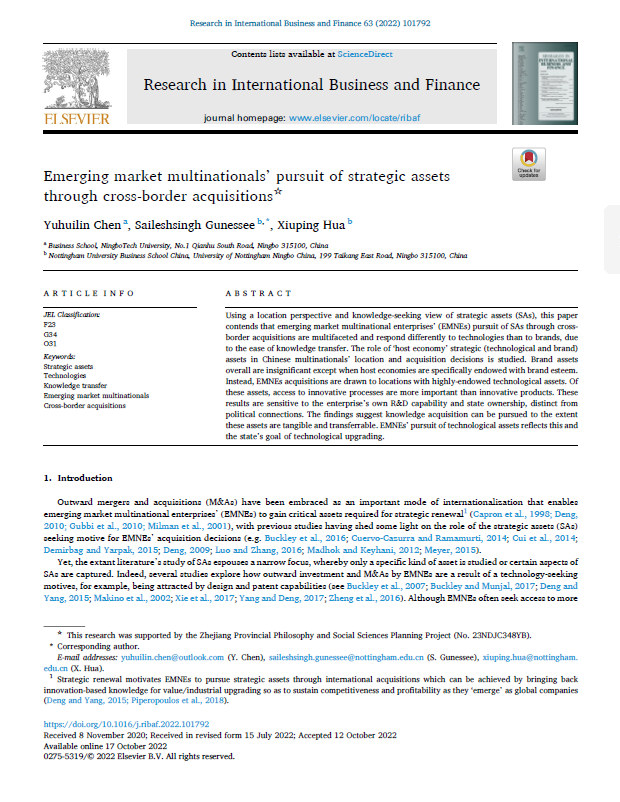 商学院青年教师陈裕荟琳博士,作为第一作者发表的研究论文《Emerging market multinationals’ pursuit of strategic assets through cross-border acquisitions》,在国际商务、金融领域重要期刊《Research in International Business and Finance》第63卷(2022)正式发表。根据JCR最新统计,《Research in International Business and Finance》影响因子为6.143,属于商务、金融类SSCI一区期刊,该期刊也是国际商务和金融领域国际公认的重要期刊。
