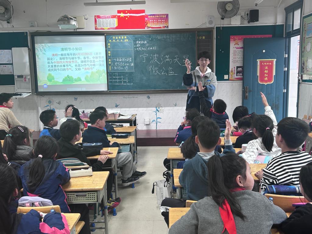 2023年3月31日,浙大宁波理工学院商学院满天星微公益活动的志愿者们来到宋诏桥小学,给四年级的小朋友们开展了一堂以“清明融于情,红色润于心”为主题的班会课,此次活动主要是为了让小朋友们了解我国清明节的相关知识。