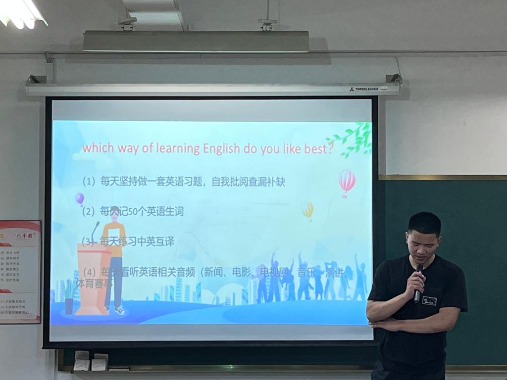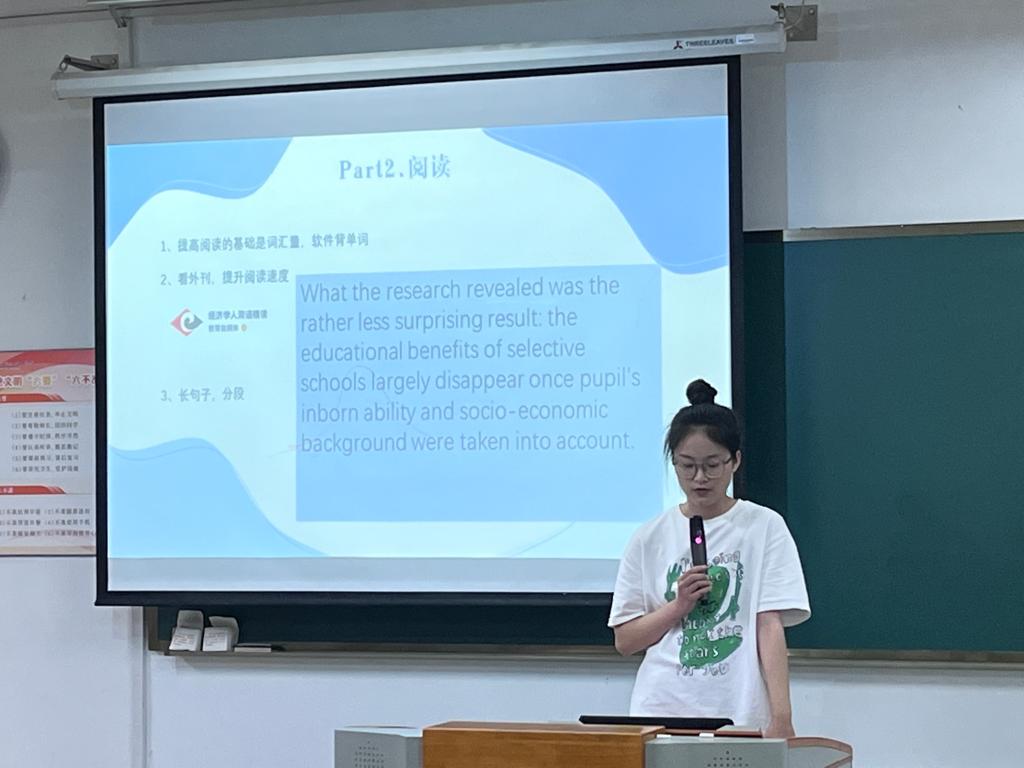 车夏雨同学和王俊辉同学从英语的三个板块——听力、阅读、写作,讲解了如何学习大学英语,分享了自己参加竞赛的经历以及感受。