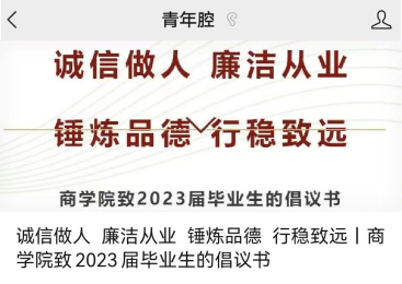 6月1日,商学院向2023届全体毕业生发出倡议,期盼毕业生铭记“明德弘毅,开物启新”的校训,诚信做人,廉洁从业,锤炼品德,行稳致远,让青春焕发出更加绚丽的光彩。