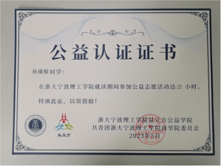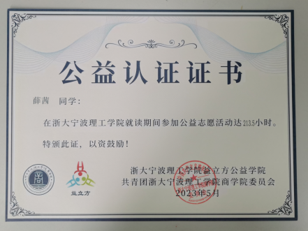 2023年5月,商学院启动一年一度的公益认证。依托“益立方”公益学院,515名累计参加公益志愿活动超过10小时的毕业生,获得了公益认证证书。其中,金融学(中美合作办学)专业191班白雪琪同学累计时长高达359小时。此外,共有87位同学累计时长超过100小时。