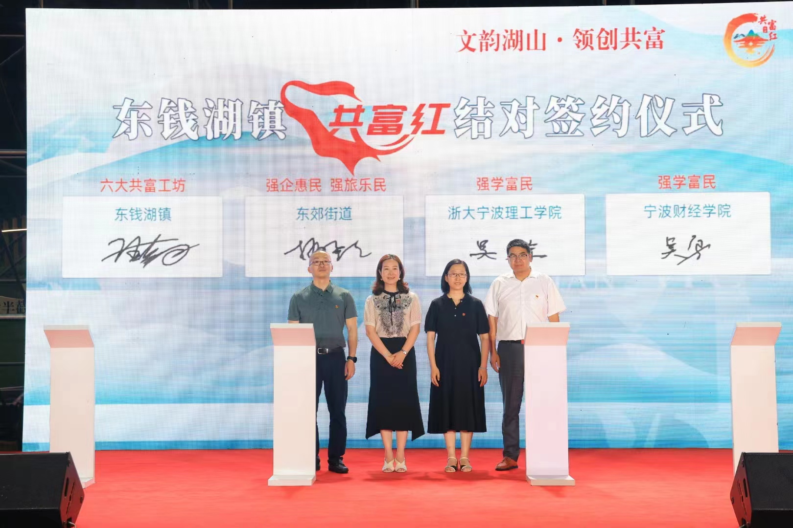 在“共富红”党建品牌发布会上,我校商学院党委、宁波财经学院以及东郊街道与东钱湖镇分别举行了共富钱湖结对签约仪式。现场同步展示了东钱湖六大共富样板:农旅洋山、宋韵俞塘、艺术城杨、漫咖利民、渔火殷湾、古风韩岭。