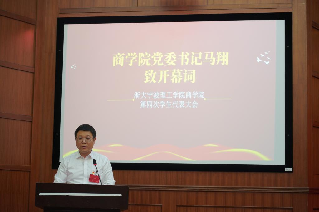 开幕式上,商学院党委书记、副院长马翔老师代表学院党委向大会致开幕词。他对出席本次大会的领导、嘉宾、代表以及为学院学生会工作做出贡献的有关部门和工作人员,表示了衷心的感谢。他表示,此次大会是我院青年学生政治生活中的一件大事,是在全院师生深入学习贯彻党的二十大精神的重要时间节点召开的一次重要会议。在充分肯定过去一年商学院学生会工作下,他代表学院党委对新一届学生会和商院学子提出了几点希望,第一,要有强烈的爱国情怀;第二,要有良好的道德品质;第三,要有积极向上的人生追求。希望商院青年学生在学习上要不断进取,在实践中要锤炼自我,为了未来更美好的人生而努力拼搏。