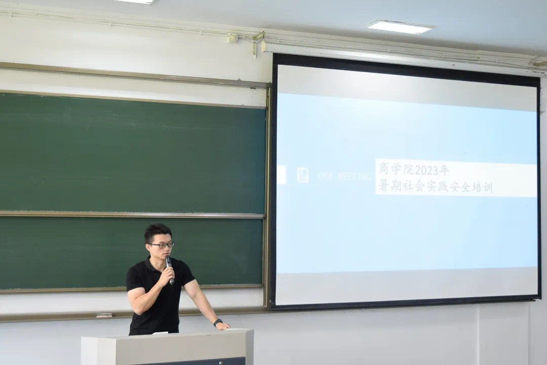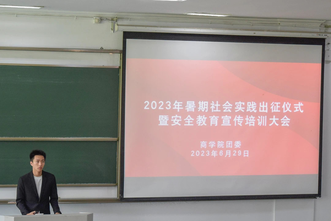 6月29日中午,商学院于SC113举行了暑期社会实践出征仪式暨安全教育宣传培训大会。商学院党委副书记、纪委书记吴琼、学院团委书记张楚铭、各社会实践团队指导老师代表、各社会实践团队负责人、宣传员及安全员参与会议。会议由国贸212班鲍昱疌同学主持。