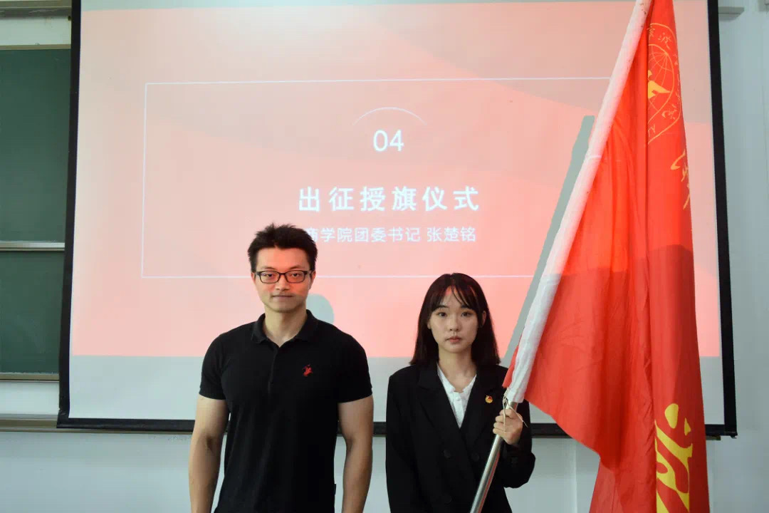 商学院团委书记张楚铭为队长代表授予了出征旗帜并合影留念。