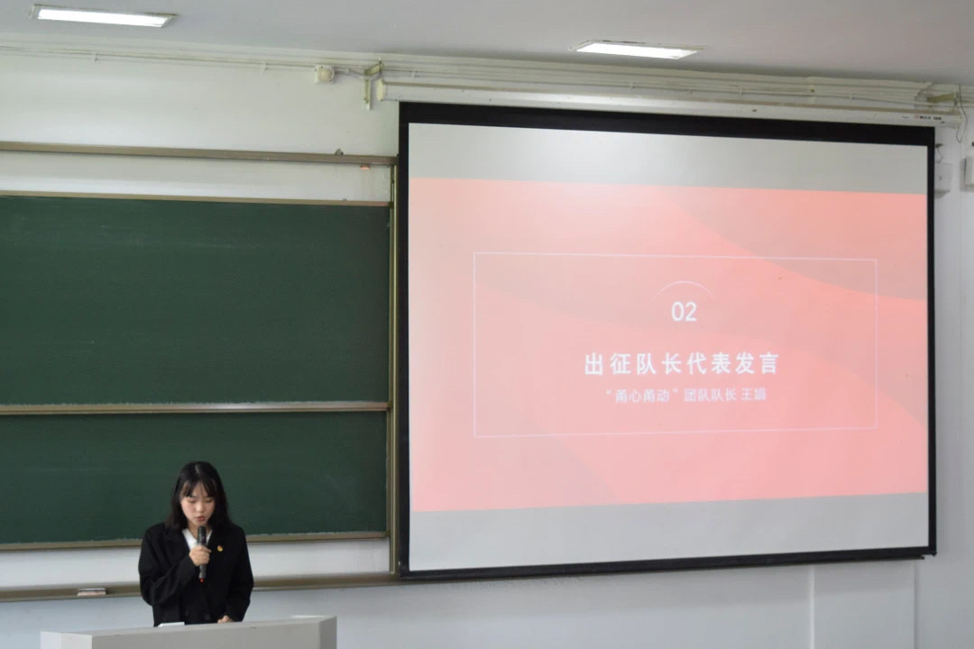 接着,甬心甬动实践团队队长王娟同学代表所有出征队长发言。她表示将全力以赴完成社会实践任务,为商学院争光。随后,王娟代表商学院所以出征队伍做承诺书宣读,对实践团队的责任和行为进行了庄重承诺,体现了商学院学子积极向上的精神风貌。
