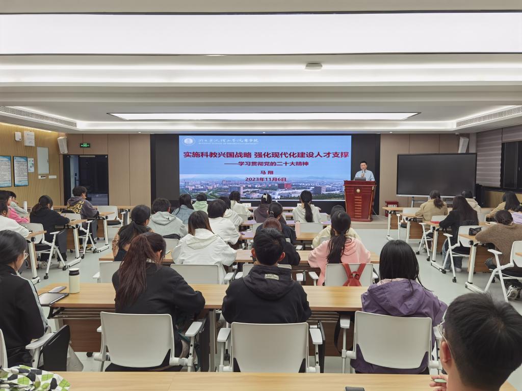 马翔书记以《实施科教兴国战略,强化现代化建设人才——学习贯彻党的二十大精神》为主题授课,以“党的二十大科教兴国战略论述”“中国式现代化建设内涵与挑战”“一流商学院建设的思想及理念”“现代化建设商科人才素质要求”四个方面来展开阐述,旨在帮助学员剖析理解党的二十大报告中对“科教兴国战略与中国式现代化建设”的论述。课上,马翔书记结合与在座学员息息相关的学院建设、愿景与人才培育的目标来诠释党的二十大报告的论述。马翔老师强调,“青年强,则国强”,全体学员要认真学习贯彻党的二十大精神,提升专业能力,让青春在全面建设社会主义现代化强国的火热实践中绽放绚丽之花。