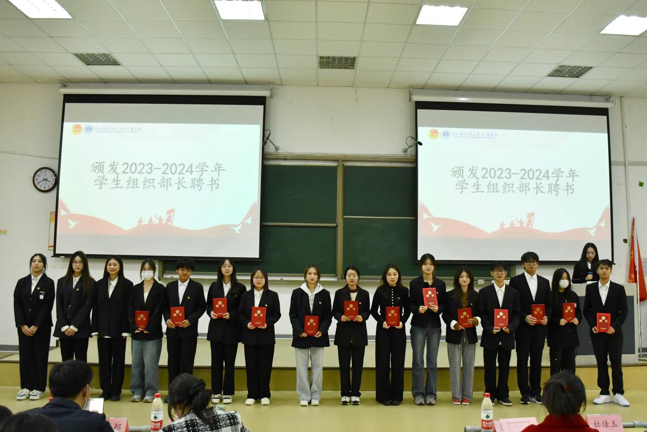 之后,吴琼老师为2023-2024学年团委书记、副书记颁发聘书,张楚铭老师为2022-2023学年主席团主席颁发考核证书。学工办老师们分别为新一届主席团主席以及各学生组织部长颁发聘书。