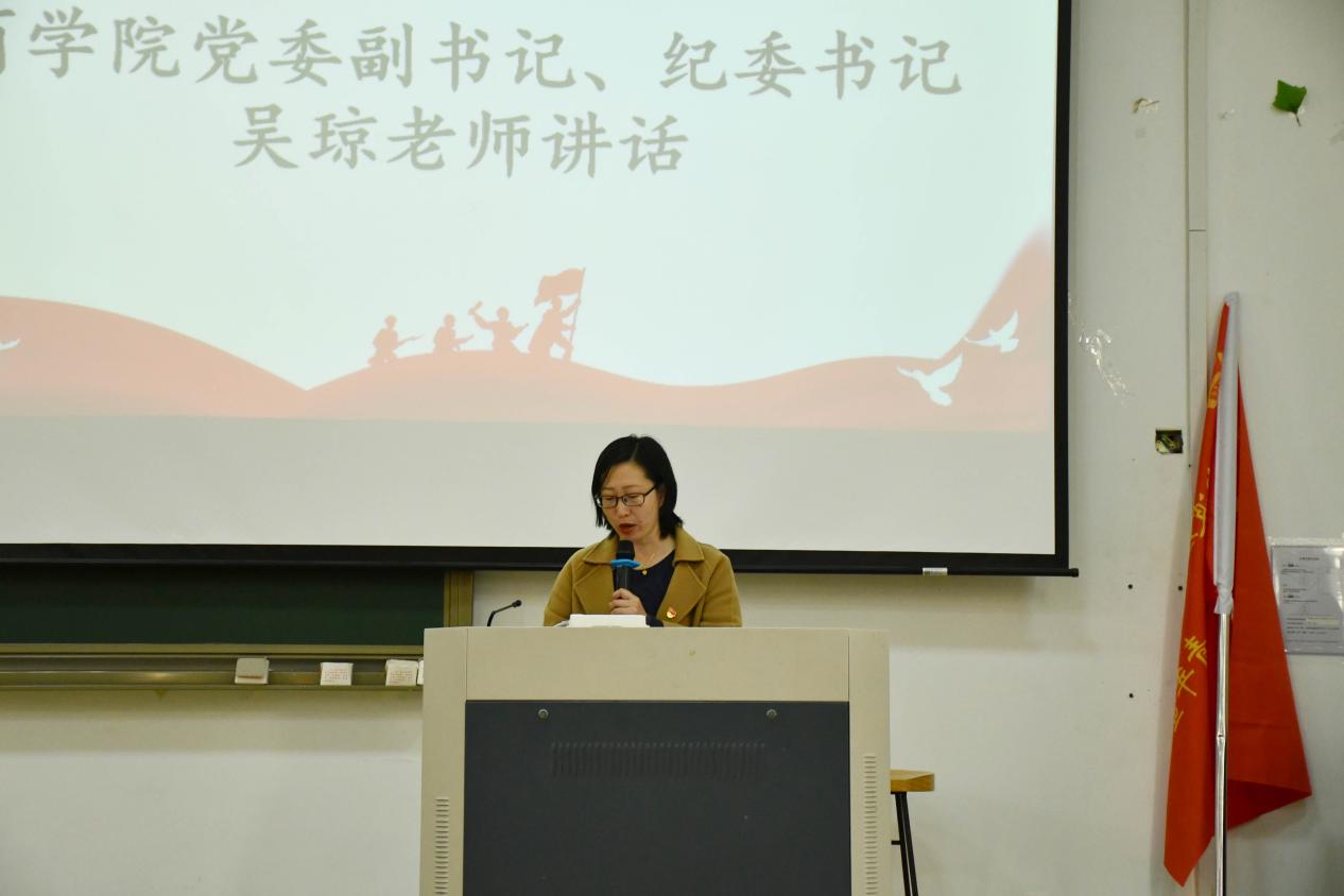 随后,学院党委副书记、纪委书记吴琼老师讲话。她首先对学院所有学生组织为学生工作辛勤付出表示感谢,对即将受聘的学生干部表示祝贺。她指出,学生干部是校园各项活动的组织者和参与者,是学院发展的一股重要力量,也是辅导员和班导师的左膀右臂。她还对如何成为一名优秀的学生干部提出了三点要求:一是要志存高远,做理论学习的先行者;二是要脚踏实地,做真抓实干的践行者;三是要不畏艰苦,做实践活动的示范者。她期待学生干部们在超越自我中谱写新时代的青春之歌。