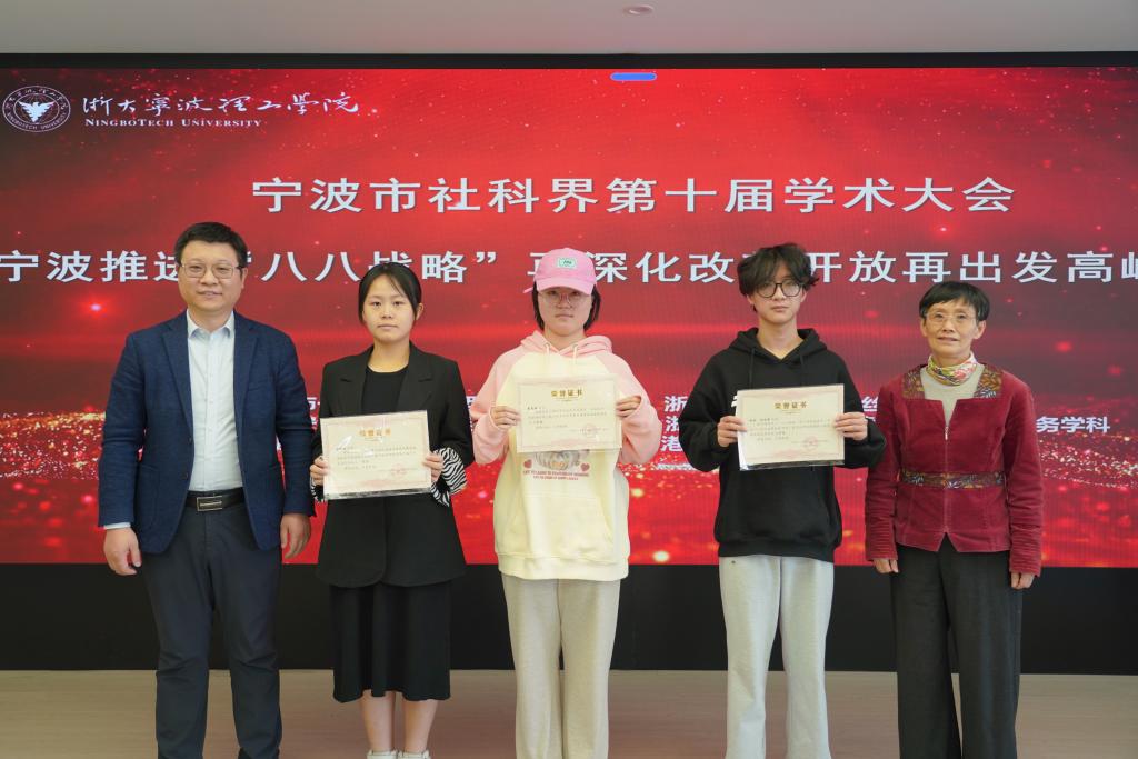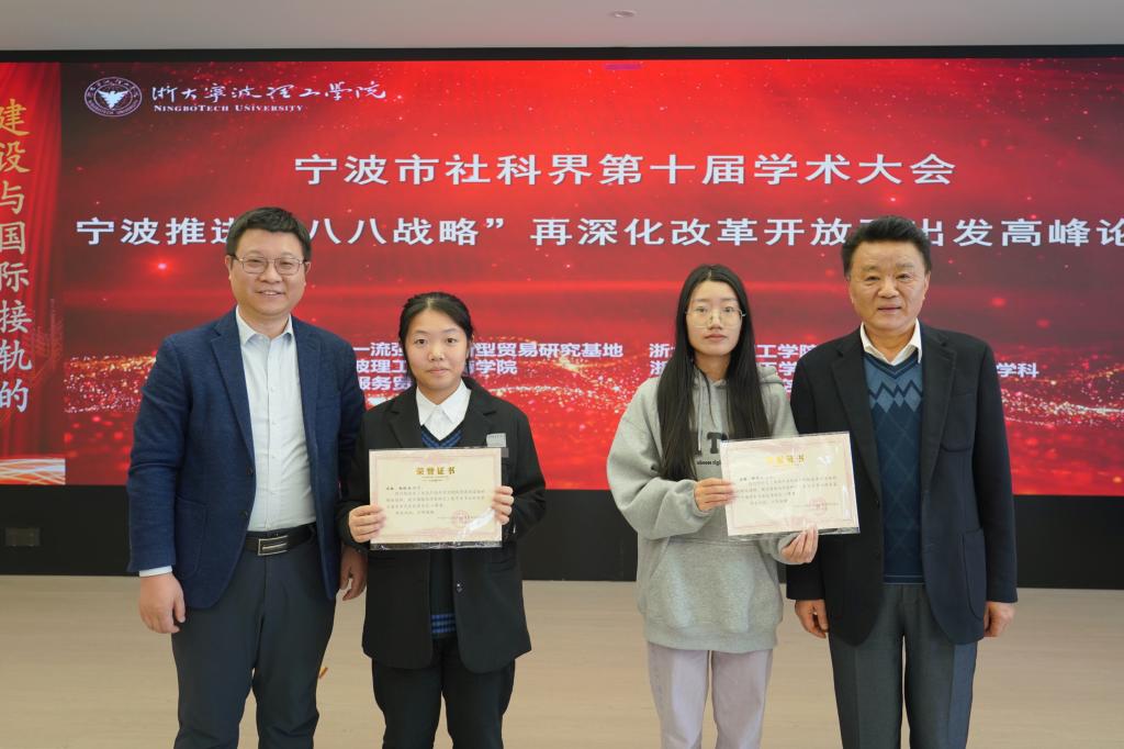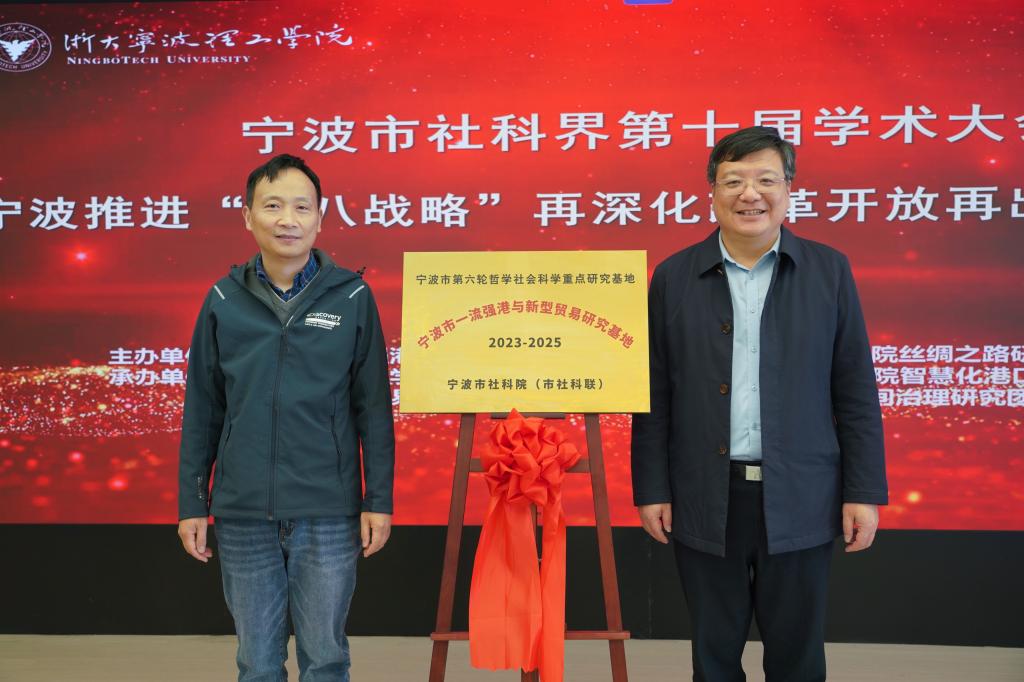致辞后,黄光杰书记与杨冰峰处长为宁波市一流强港与新型贸易研究基地进行揭牌,并为基地学术委员会专家委员颁发聘书。浙大宁波理工学院商学院党委书记、宁波市金融研究院院长马翔教授与研究基地研究员为会议投稿获奖论文颁奖。