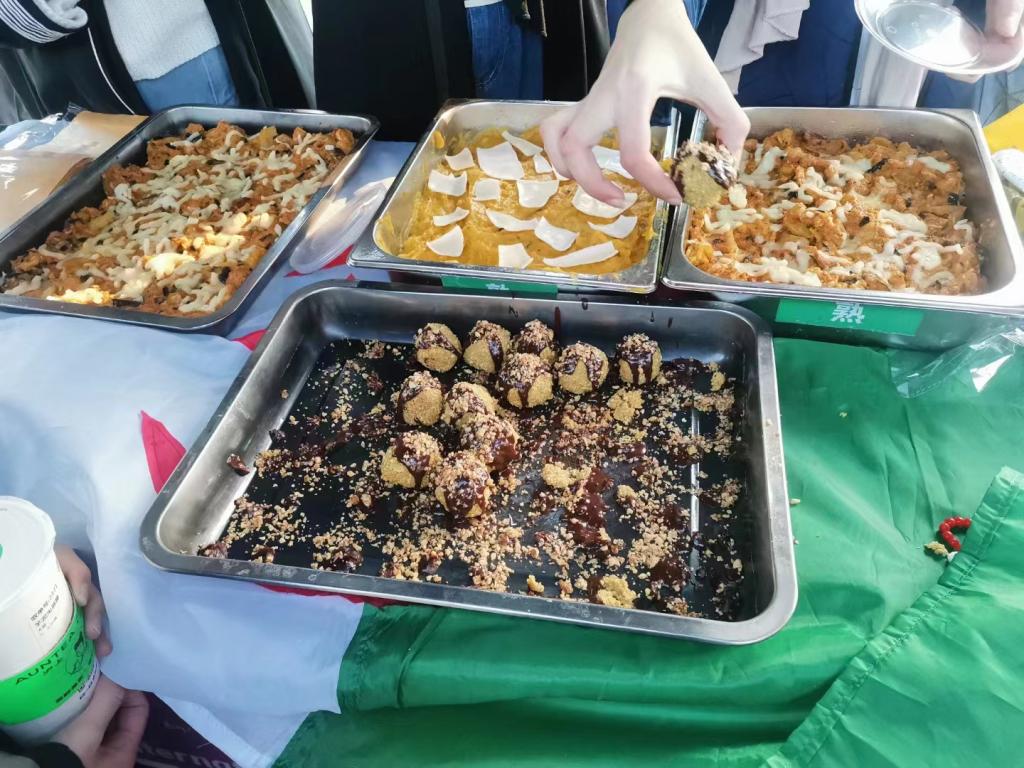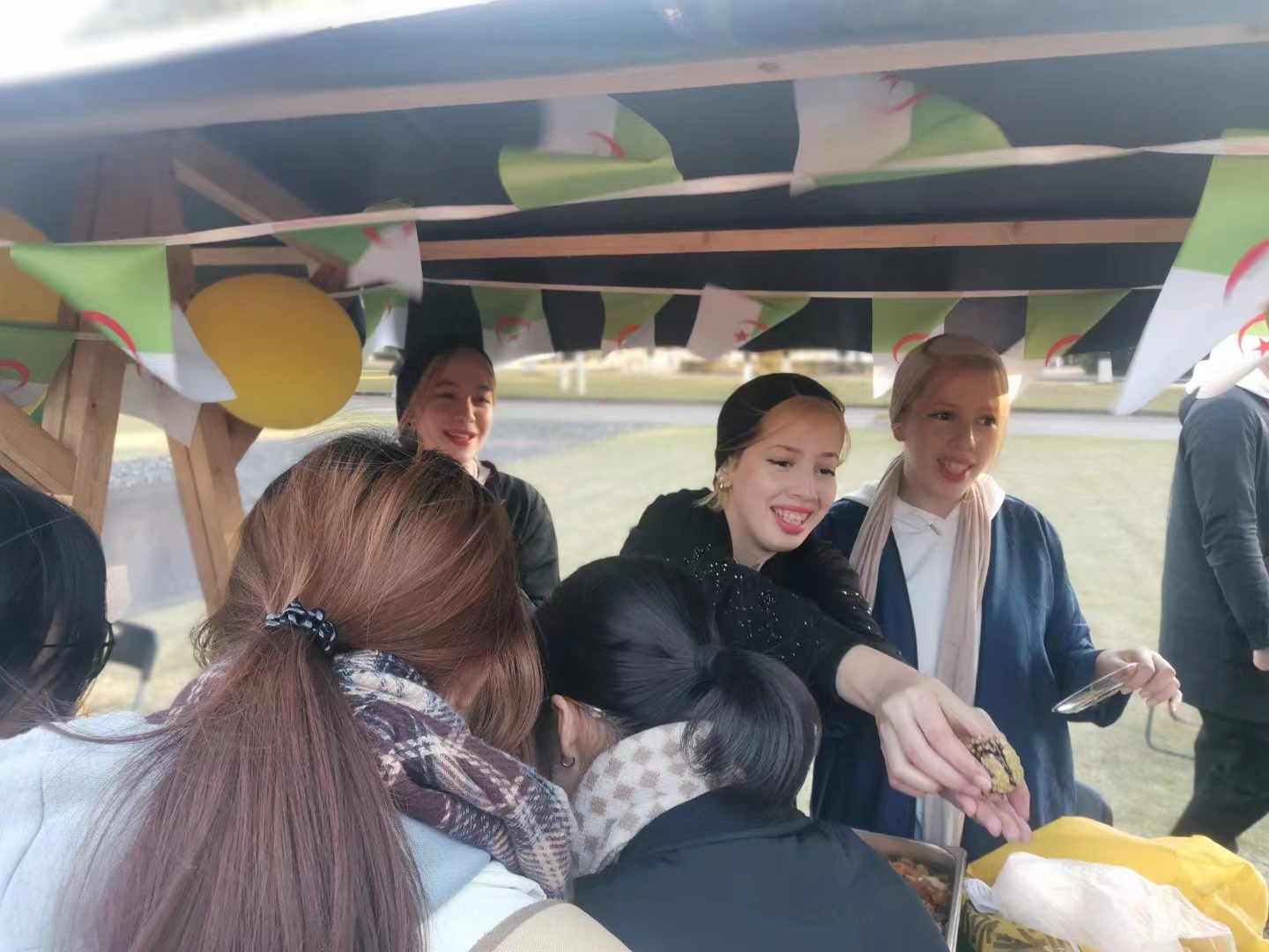 在文化集市区域,国际学生们纷纷穿着家乡的传统服饰,在自己精心布置的展位上展示自己国家的文化和特色。整个现场充满了浓厚的异国风情。来自摩洛哥、阿尔及利亚、印度、孟加拉的师生们亲手烹饪了一道道传统美食,提供给现场师生享用,各个展位前大排长龙,门庭若市,刚出锅的美食短短十几分钟就被一扫而空。