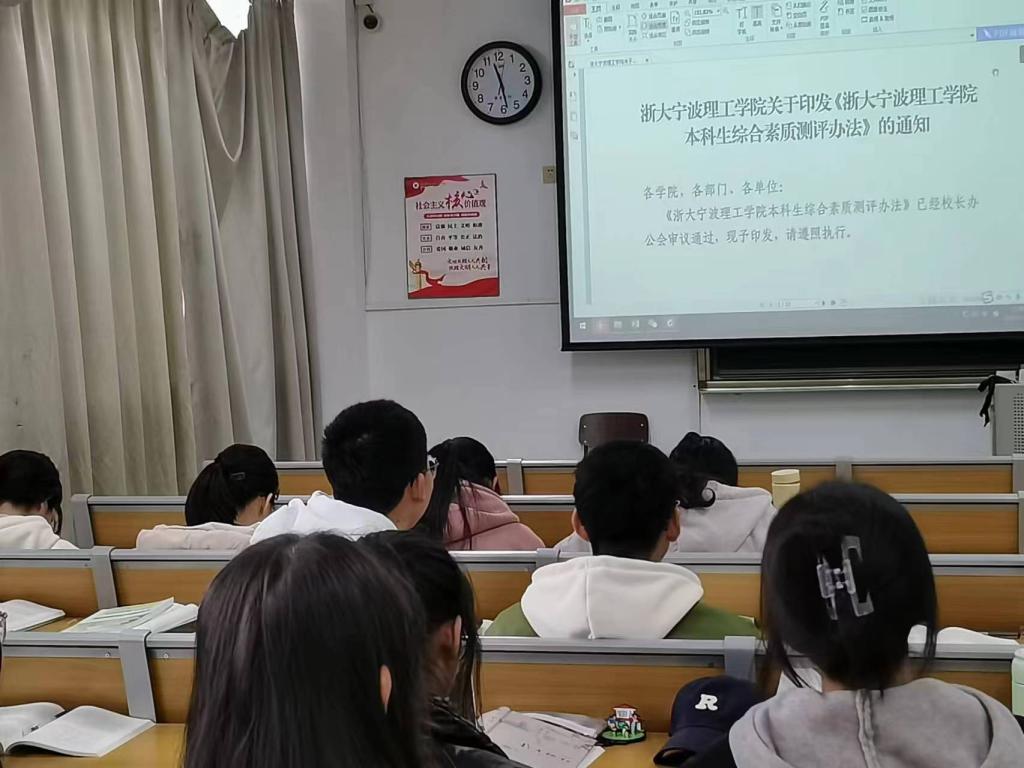 《浙大宁波理工学院商学院本科生综合素质测评办法》出台后,在学院的统一安排下,各班班长第一时间组织了综测解读专题班会,并就同学存在的疑问进行了收集。