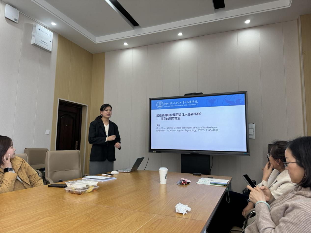 穆鑫岩博士在会上分享论文,在《应用心理学杂志》上发表的《担任领导职位是否会让人感到孤独?--性别的调节效应(Ong, W. J. (2022). Gender- contingent effects of leadership on loneliness. Journal of Applied Psychology, 107(7), 1180-1202. )。该论文研究了领导力对男性和女性员工孤独感的影响差异。分享结束后,大家围绕论文的框架、研究方法、结论等方面进行了热烈讨论,并结合自身经验分享了对领导力和孤独感的看法。