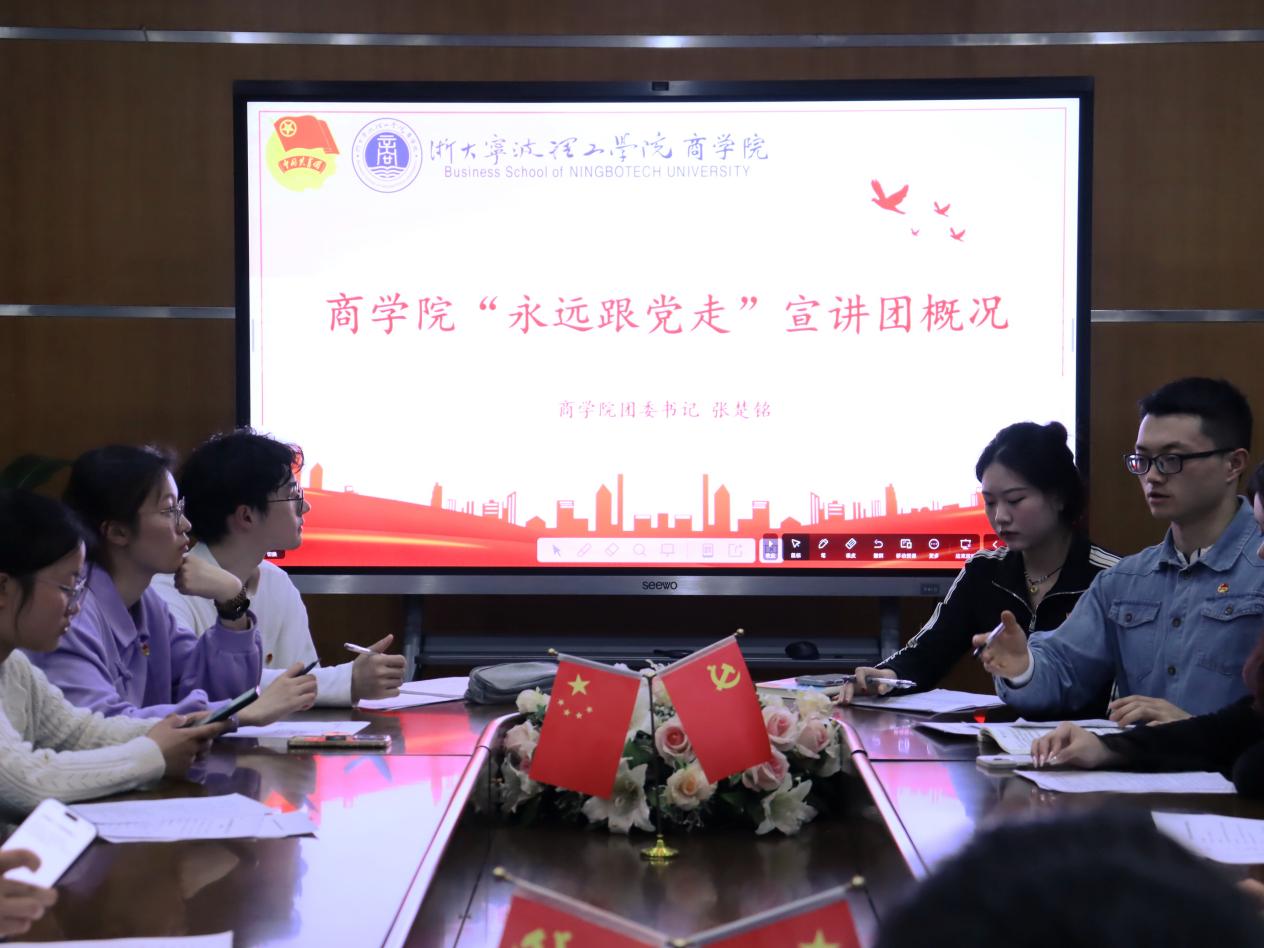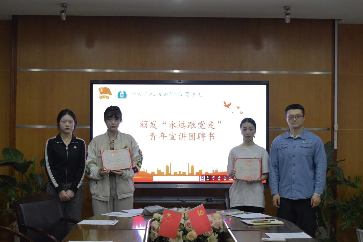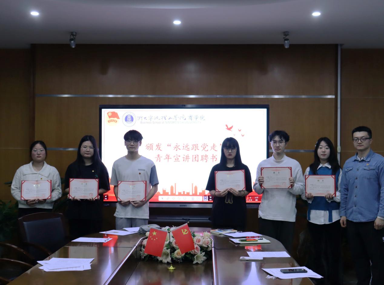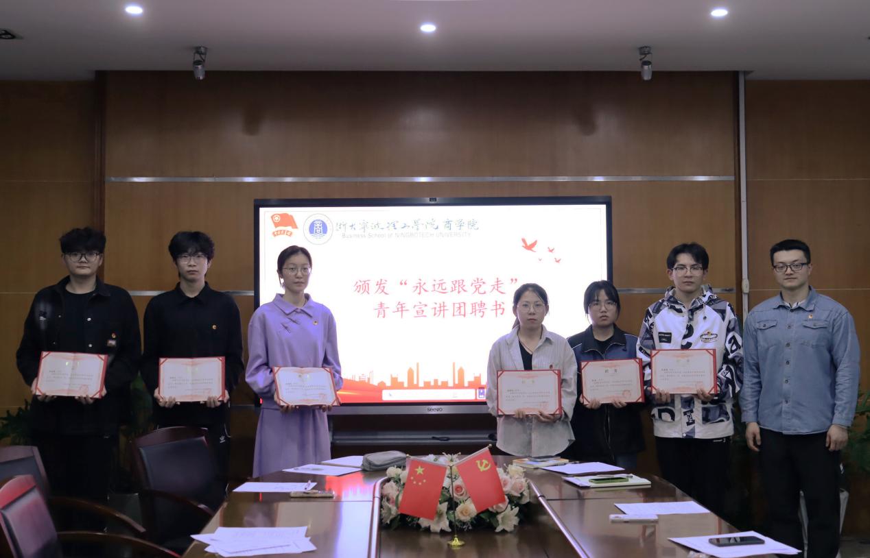 张楚铭介绍商学院"永远跟党走"青年宣讲团概况。他强调,今年是中华人民共和国成立75周年,2023级团支书作为第二批"永远跟党走"青年宣讲团成员,要关心国家发展,学习理论知识,打造优质团课,走进班级、走向社区开展理论宣讲。之后进行商学院"永远跟党走"青年宣讲团聘任仪式。团委书记张楚铭、团委副书记(学生)苏雪柯为2023级团支书颁发聘书。