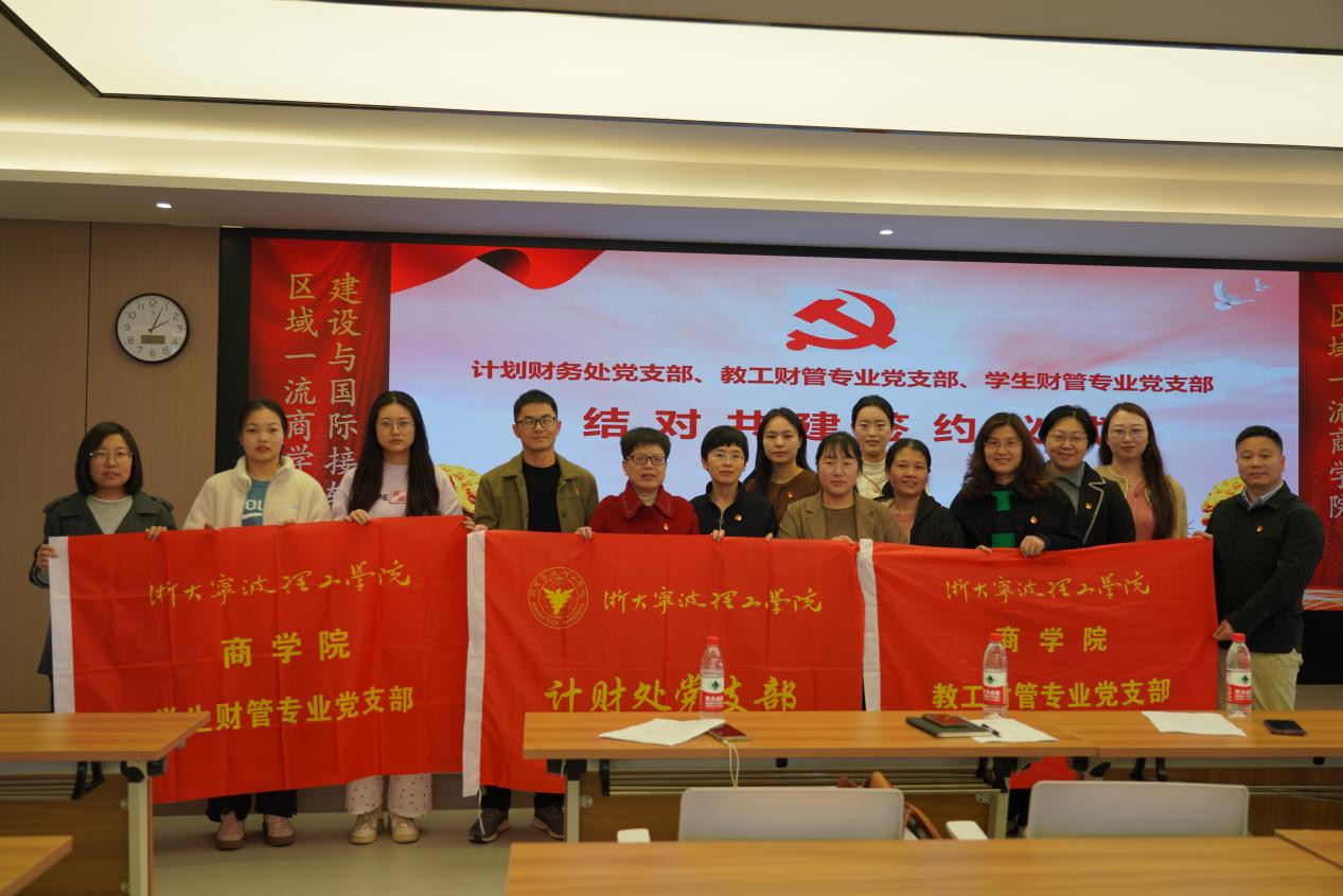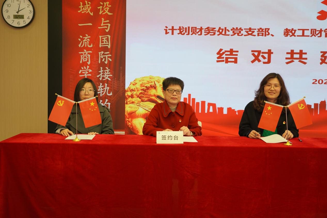 计划财务处党支部书记王华美、商学院教工财管专业党支部书记王山慧、商学院学生财管专业党支部书记杜佳玉上台签署支部结对共建协议书,三个支部的党员代表合影留念。