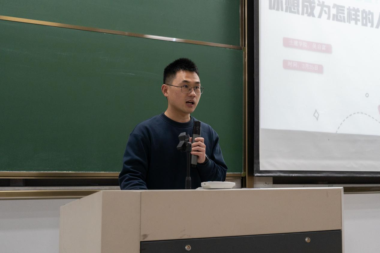 随后,吴启富老师进行了以“你想成为怎样的自己”为主题的团课。他指出,新时代青年应从“认清自我”、“提升自我”、“放下自我”这三个方面出发来思考自己的人生目标。紧接着,吴启富老师分享了自己的学习经历和考研历程,向同学们仔细介绍认清自我的流程,分别是:问自己,问别人,问世界。只有当我们开始意识到自我的重要性并不断地探索和了解自我之后,才能超越自己,开拓自己,遇见全新的自我。