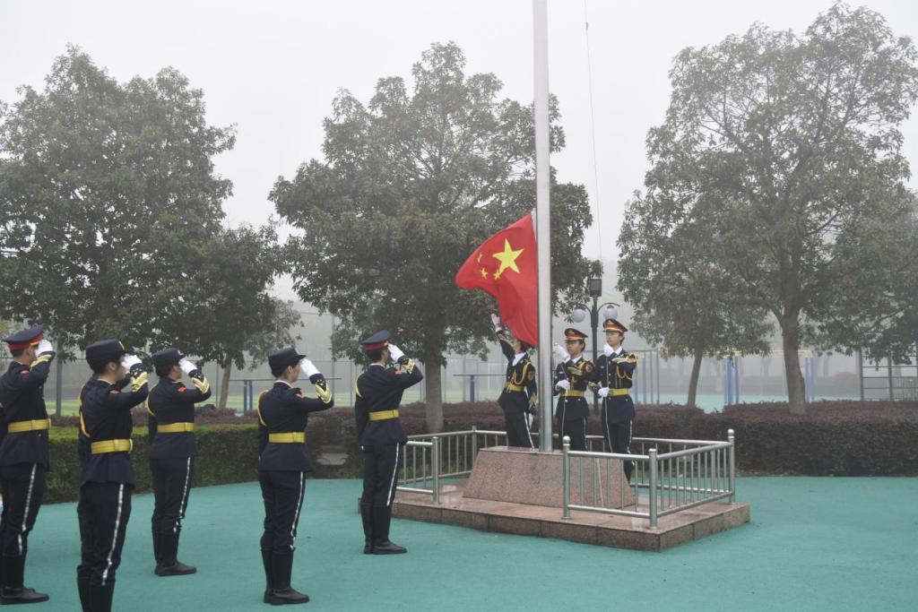 国旗护卫队的同学们迈着坚定的步伐,将鲜艳的五星红旗缓缓升至旗杆顶端。全体师生肃立,目光坚定,向国旗行注目礼,表达对祖国的热爱和敬意。