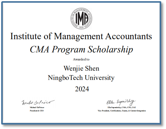 近期,商学院高佳桐、张怡婷等10位学生荣获IMA中国CMA(美国注册管理会计师)奖学金。自2017年起,商学院高级培训中心组织CMA培训并推荐学生申请CMA奖学金以来,已有近100名学生获此殊荣并通过CMA考试,获得CMA证书。