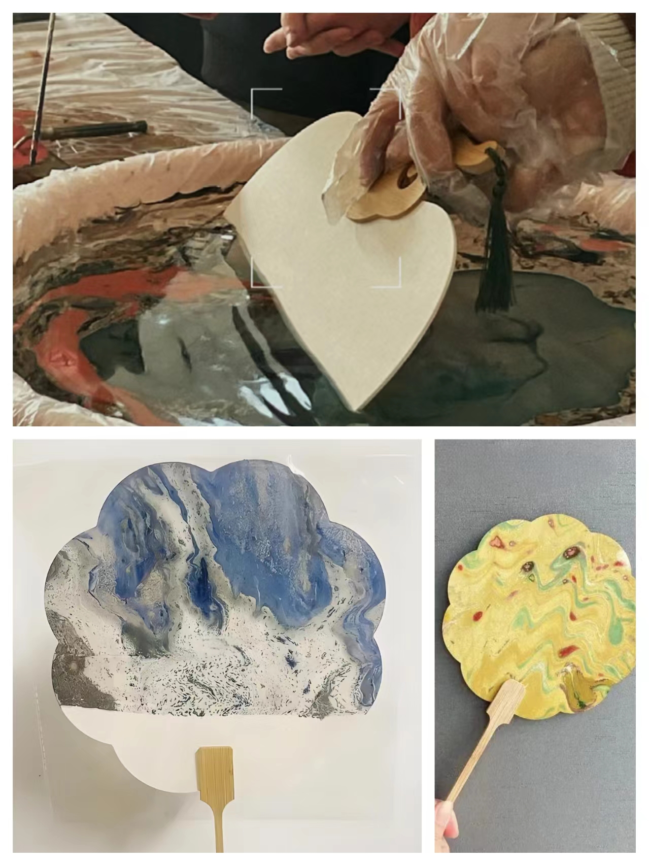 在工作人员的指导下,活动现场洋溢着轻松愉悦的氛围。老师们发挥着自己的审美眼光,巧妙地设计扇面,将干花粘在团扇上,制作花团锦簇的永生花团扇。漆扇制作现场,老师们将搭配好颜色的漆液相继滴在水面上,以小木棍将漆液在水中引导,形成不同的形态,或长或短,有疏有密。大家尝试了很多不同的入水方式,手中的扇子形成了各具特色的水波纹样,每一把扇子都是独一无二的。