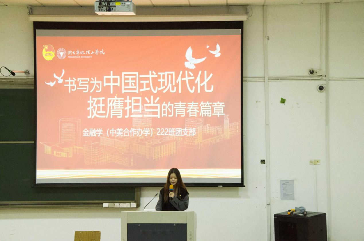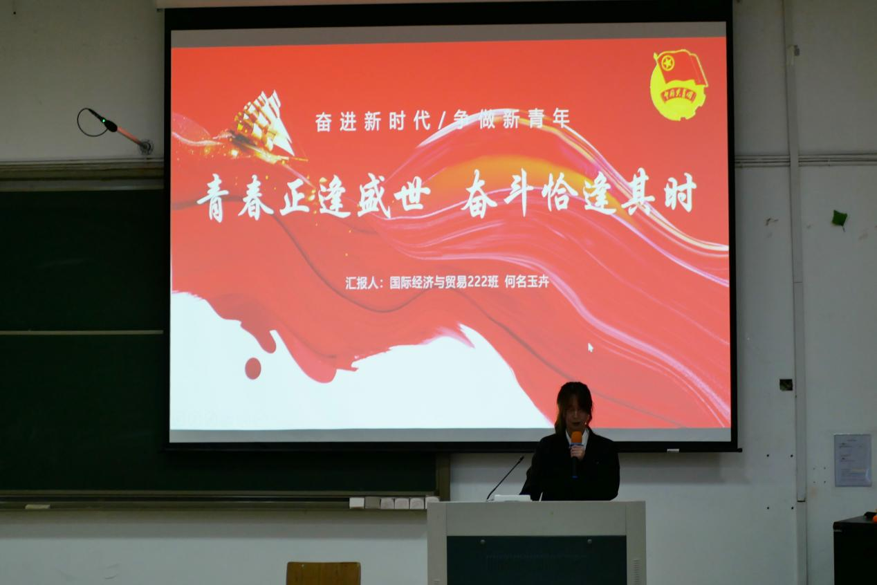 国际经济与贸易222团支部开展的团日活动紧密结合时政热点,提出了争做"四有好青年"的目标理念——扬起奋斗之帆,牢记青年使命,勇担强国重任,有理想有追求,要用青春和汗水创造出新征程上的新奇迹!