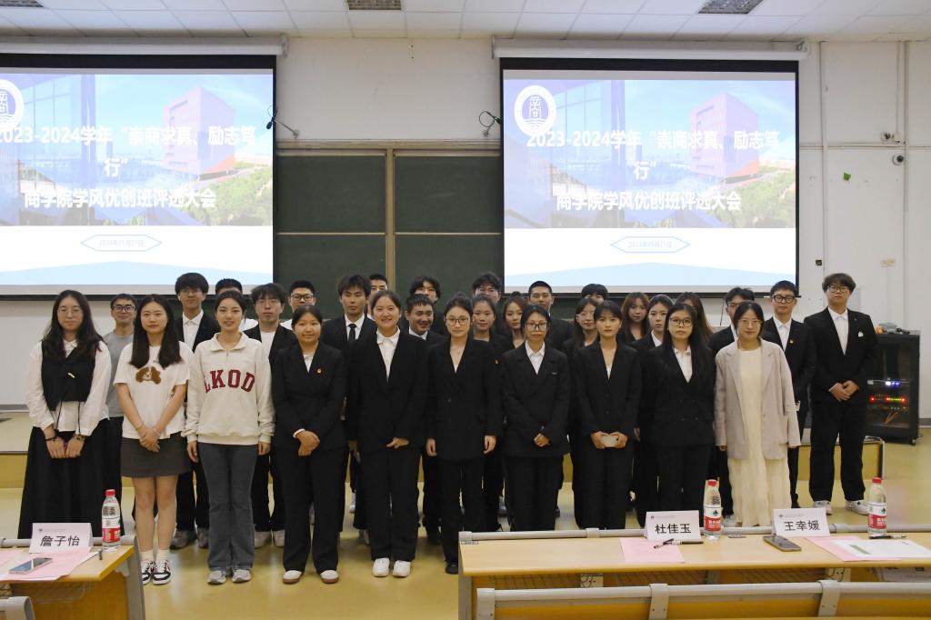 夏风轻拂书卷香,学风浓郁意绵长。为营造商学院良好的学风氛围,5月21日晚,商学院于SB104举行2023-2024学年“崇商求真、励志笃行”学风优创班评比大会。商学院党委副书记、纪委书记吴琼老师,商学院团委副书记王幸媛老师,学工办杜佳玉老师以及商学院学生会、团委主席团成员担任评委,学风建设部赵羽承主持,学院各班级代表及各班观赛代表参加此次评选活动。