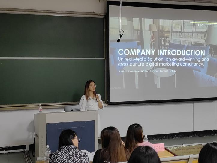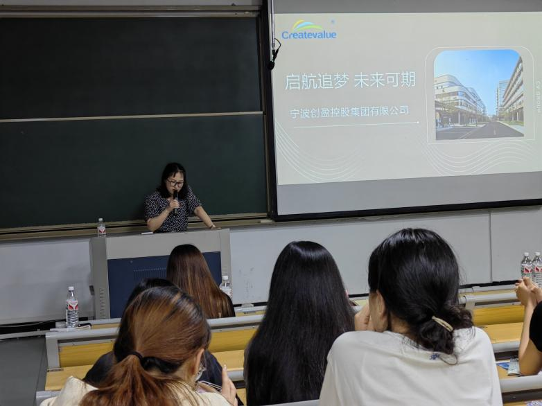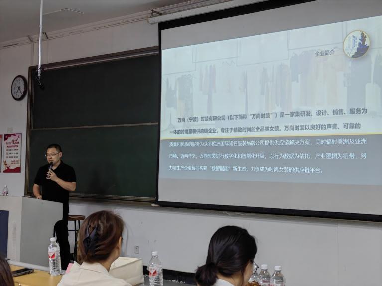 万尚(宁波)时装有限公司人事经理欧阳卓通过生动的视频和PPT展示,介绍了万尚的具体岗位需求、薪资待遇、工作优势等方面的情况,让学生们能够更加了解未来工作的性质与工作的环境。